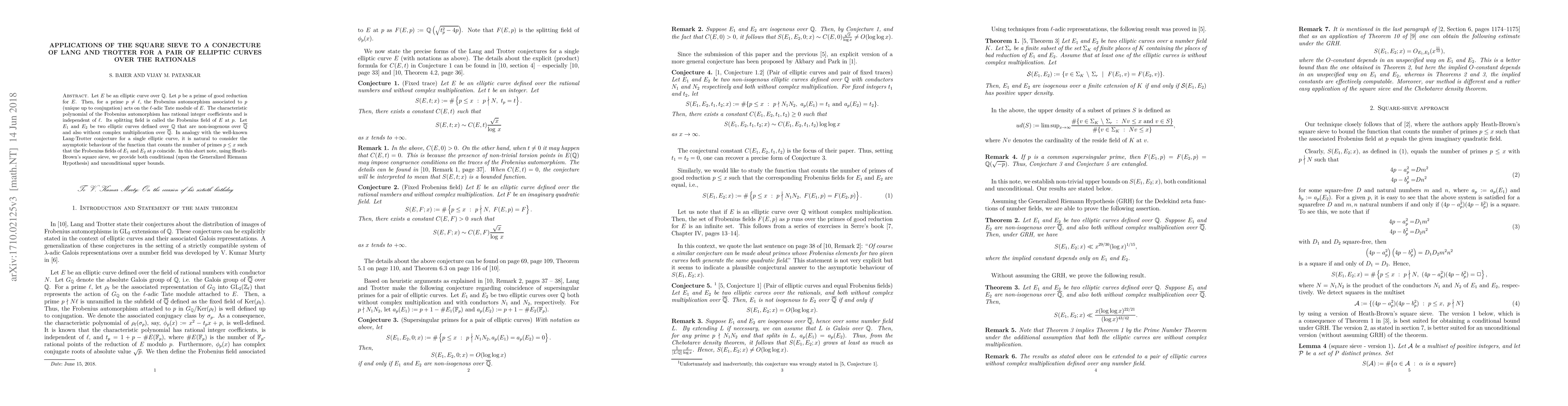 Let $E$ be an elliptic curve over $\mathbb{Q}$. Let $p$ be a prime of good reduction for $E$. Then, for a prime $p \neq \ell$, the Frobenius automorphism associated to $p$ (unique up to conjugation) acts on the $\ell$-adic Tate module of $E$. The characteristic polynomial of the Frobenius automorphism has rational integer coefficients and is independent of $\ell$. Its splitting field is called the Frobenius field of $E$ at $p$. Let $E_1$ and $E_2$ be two elliptic curves defined over $\mathbb{Q}$ that are non-isogenous over $\overline{\mathbb{Q}}$ and also without complex multiplication over $\overline{\mathbb{Q}}$. In analogy with the well-known Lang-Trotter conjecture for a single elliptic curve, it is natural to consider the asymptotic behaviour of the function that counts the number of primes $p \leq x$ such that the Frobenius fields of $E_1$ and $E_2$ at $p$ coincide. In this short note, using Heath-Brown's square sieve, we provide both conditional (upon the Generalized Riemann Hypothesis) and unconditional upper bounds.
