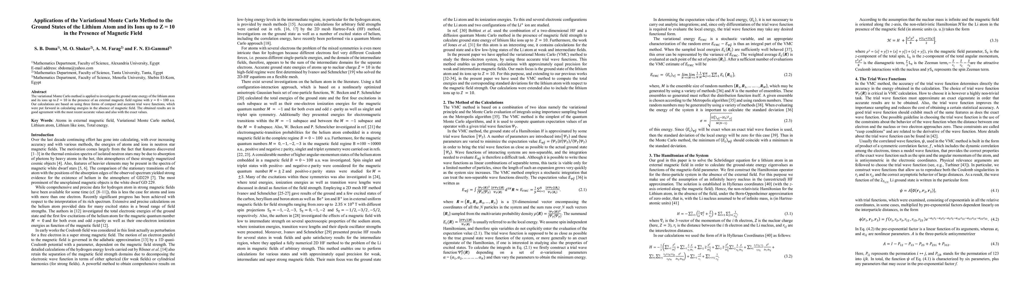 The variational Monte Carlo method is used to study the ground state energies of lithium atom and its ions up to Z=10 under varying magnetic fields. The results align well with recent accurate and exact values, demonstrating the method's effectiveness.