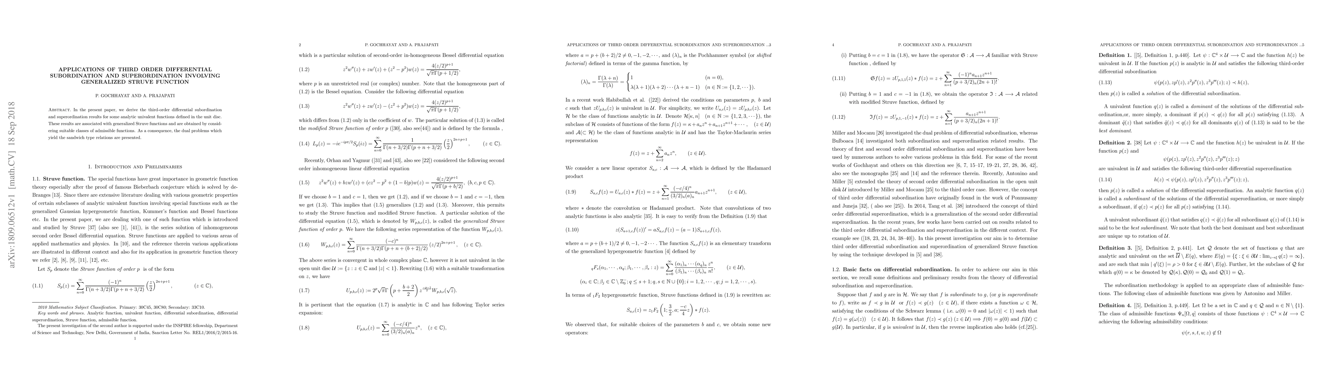 In the present paper, we derive the third-order differential subordination and superordination results for some analytic univalent functions defined in the unit disc. These results are associated with generalized Struve functions and are obtained by considering suitable classes of admissible functions. As a consequence, the dual problems which yield the sandwich type relations are presented.