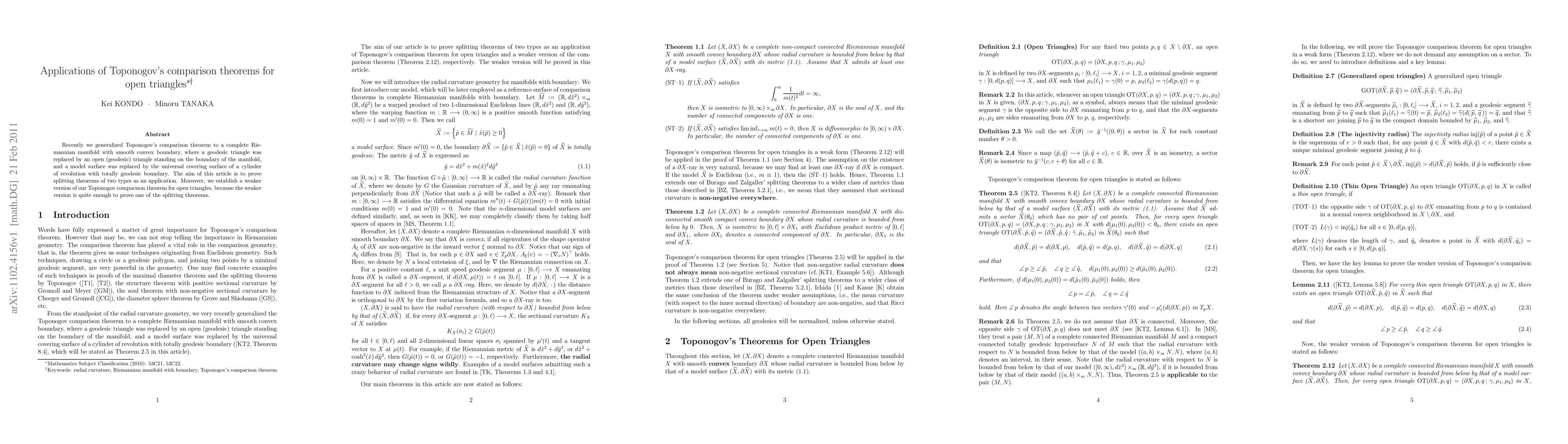 This paper generalizes Toponogov's comparison theorem to open geodesic triangles on the boundary of a complete Riemannian manifold, establishing a weaker version sufficient to prove two types of splitting theorems.