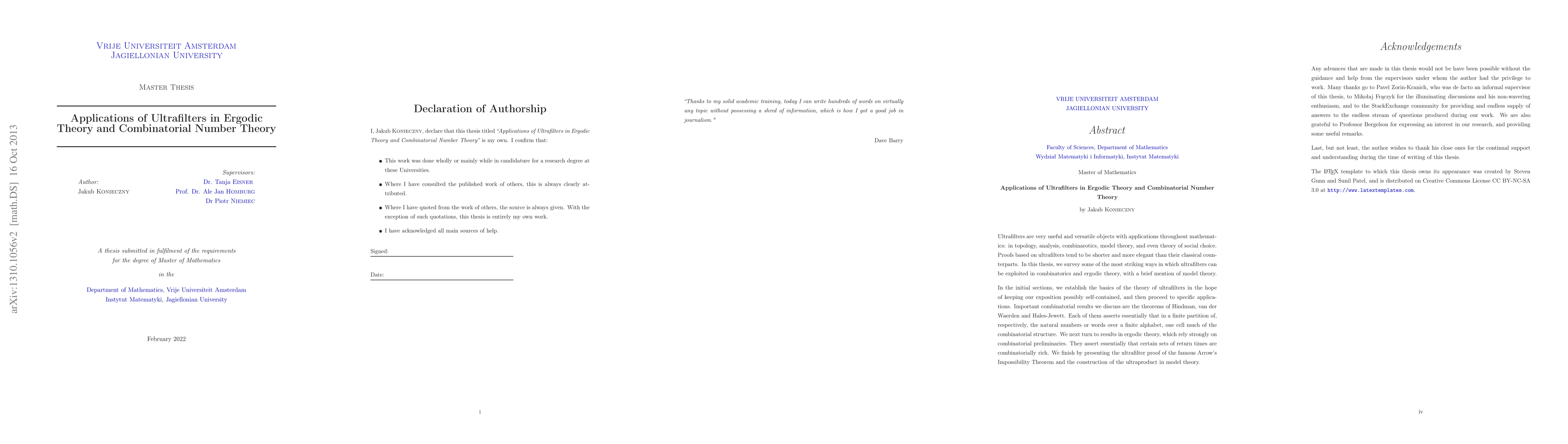 This paper surveys the applications of ultrafilters in combinatorial number theory and ergodic theory, emphasizing their elegance in proofs. It discusses significant combinatorial results like Hindman's, van der Waerden's, and Hales-Jewett theorems, and applies ultrafilters to ergodic theory results and Arrow's Impossibility Theorem.