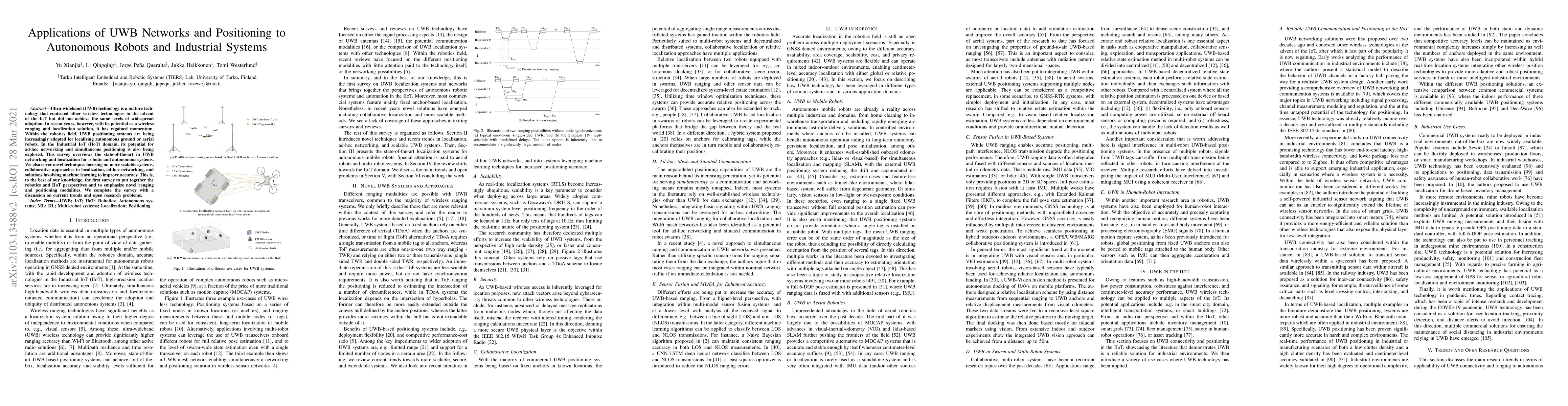 This paper surveys the state-of-the-art applications of ultra-wideband (UWB) technology in localizing autonomous robots and in industrial IoT systems, highlighting novel techniques for scalable, collaborative, and machine learning-enhanced positioning. It also discusses current trends and open research challenges.
