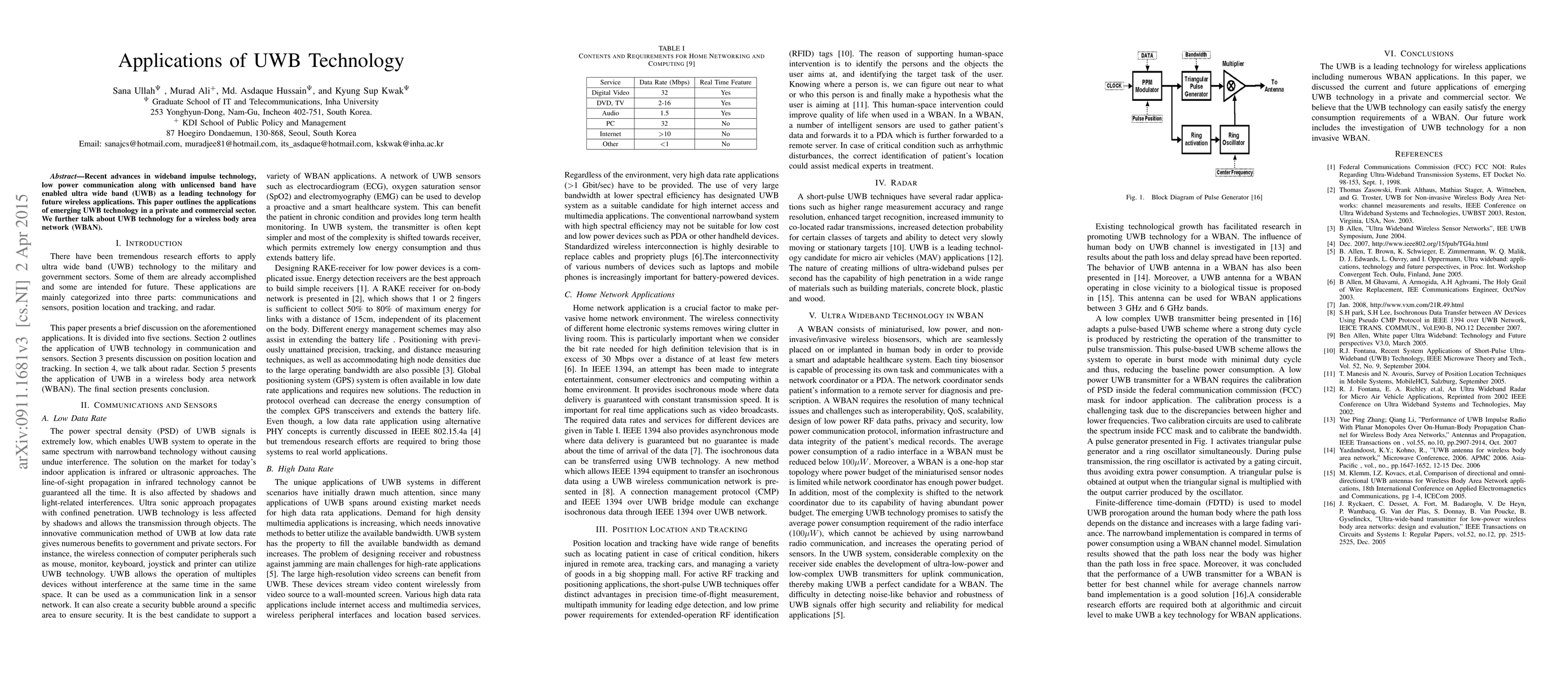 Summary: This paper explores the potential applications of ultra-wideband (UWB) technology in both private and commercial sectors, highlighting its role in low power communication and its use in wireless body area networks (WBAN). The advancements in UWB technology are poised to revolutionize future wireless applications.