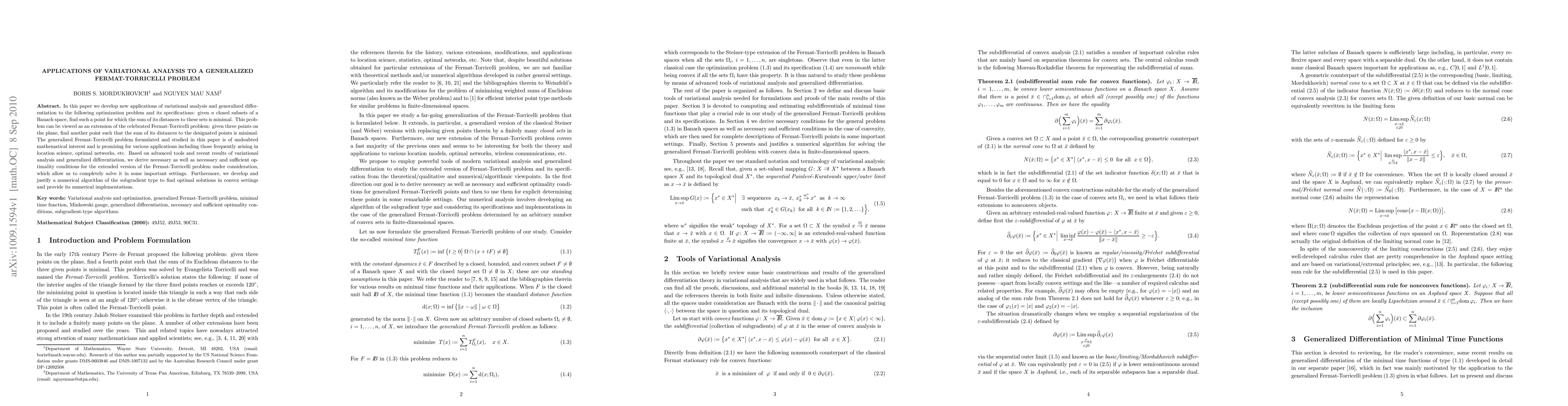 In this paper we develop new applications of variational analysis and generalized differentiation to the following optimization problem and its specifications: given n closed subsets of a Banach space, find such a point for which the sum of its distances to these sets is minimal. This problem can be viewed as an extension of the celebrated Fermat-Torricelli problem: given three points on the plane, find another point such that the sum of its distances to the designated points is minimal. The generalized Fermat-Torricelli problem formulated and studied in this paper is of undoubted mathematical interest and is promising for various applications including those frequently arising in location science, optimal networks, etc. Based on advanced tools and recent results of variational analysis and generalized differentiation, we derive necessary as well as necessary and sufficient optimality conditions for the extended version of the Fermat-Torricelli problem under consideration, which allow us to completely solve it in some important settings. Furthermore, we develop and justify a numerical algorithm of the subgradient type to find optimal solutions in convex settings and provide its numerical implementations.