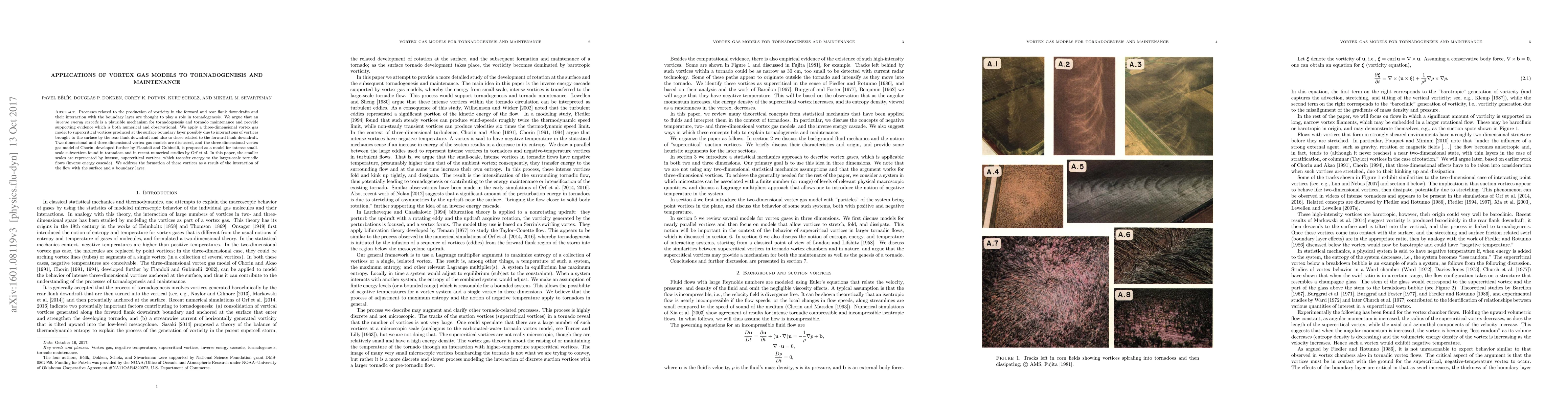 Processes related to the production of vorticity in the forward and rear flank downdrafts and their interaction with the boundary layer are thought to play a role in tornadogenesis. We argue that an inverse energy cascade is a plausible mechanism for tornadogenesis and tornado maintenance and provide supporting evidence which is both numerical and observational. We apply a three-dimensional vortex gas model to supercritical vortices produced at the surface boundary layer possibly due to interactions of vortices brought to the surface by the rear flank downdraft and also to those related to the forward flank downdraft. Two-dimensional and three-dimensional vortex gas models are discussed, and the three-dimensional vortex gas model of Chorin, developed further by Flandoli and Gubinelli, is proposed as a model for intense small- scale subvortices found in tornadoes and in recent numerical studies by Orf et al. In this paper, the smaller scales are represented by intense, supercritical vortices, which transfer energy to the larger-scale tornadic flows (inverse energy cascade). We address the formation of these vortices as a result of the interaction of the flow with the surface and a boundary layer.