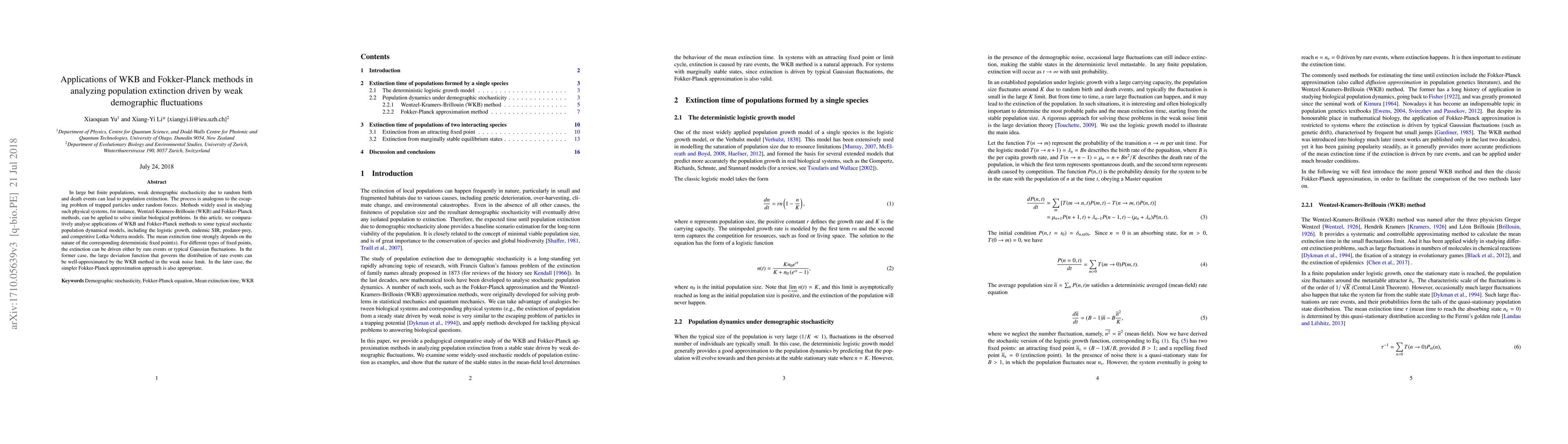 In large but finite populations, weak demographic stochasticity due to random birth and death events can lead to population extinction. The process is analogous to the escaping problem of trapped particles under random forces. Methods widely used in studying such physical systems, for instance, Wentzel-Kramers-Brillouin (WKB) and Fokker-Planck methods, can be applied to solve similar biological problems. In this article, we comparatively analyse applications of WKB and Fokker-Planck methods to some typical stochastic population dynamical models, including the logistic growth, endemic SIR, predator-prey, and competitive Lotka-Volterra models. The mean extinction time strongly depends on the nature of the corresponding deterministic fixed point(s). For different types of fixed points, the extinction can be driven either by rare events or typical Gaussian fluctuations. In the former case, the large deviation function that governs the distribution of rare events can be well-approximated by the WKB method in the weak noise limit. In the later case, the simpler Fokker-Planck approximation approach is also appropriate.