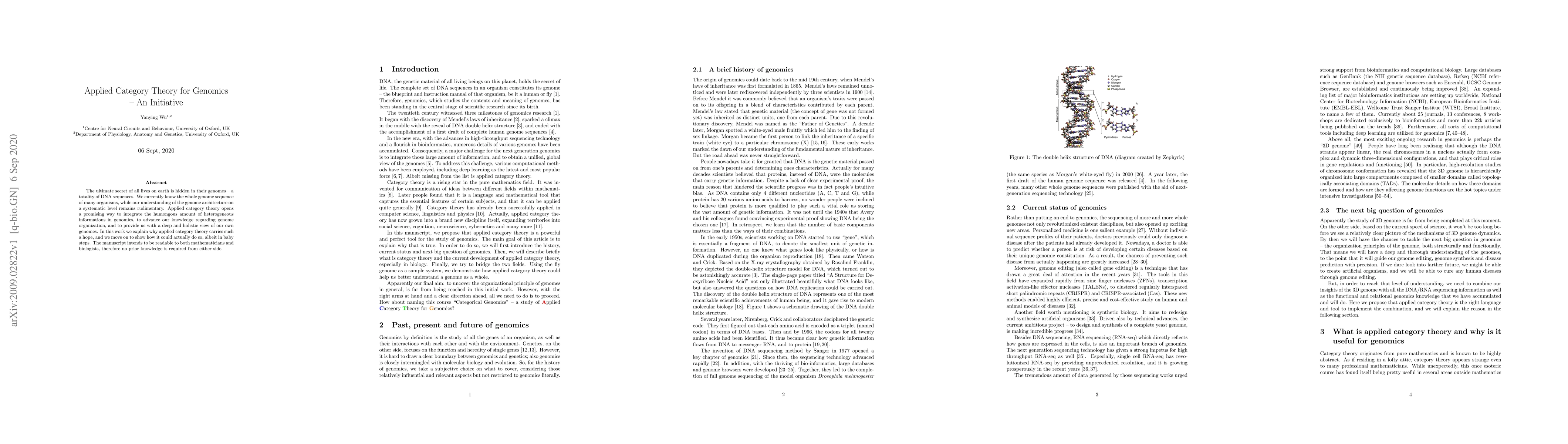 The ultimate secret of all lives on earth is hidden in their genomes -- a totality of DNA sequences. We currently know the whole genome sequence of many organisms, while our understanding of the genome architecture on a systematic level remains rudimentary. Applied category theory opens a promising way to integrate the humongous amount of heterogeneous informations in genomics, to advance our knowledge regarding genome organization, and to provide us with a deep and holistic view of our own genomes. In this work we explain why applied category theory carries such a hope, and we move on to show how it could actually do so, albeit in baby steps. The manuscript intends to be readable to both mathematicians and biologists, therefore no prior knowledge is required from either side.
