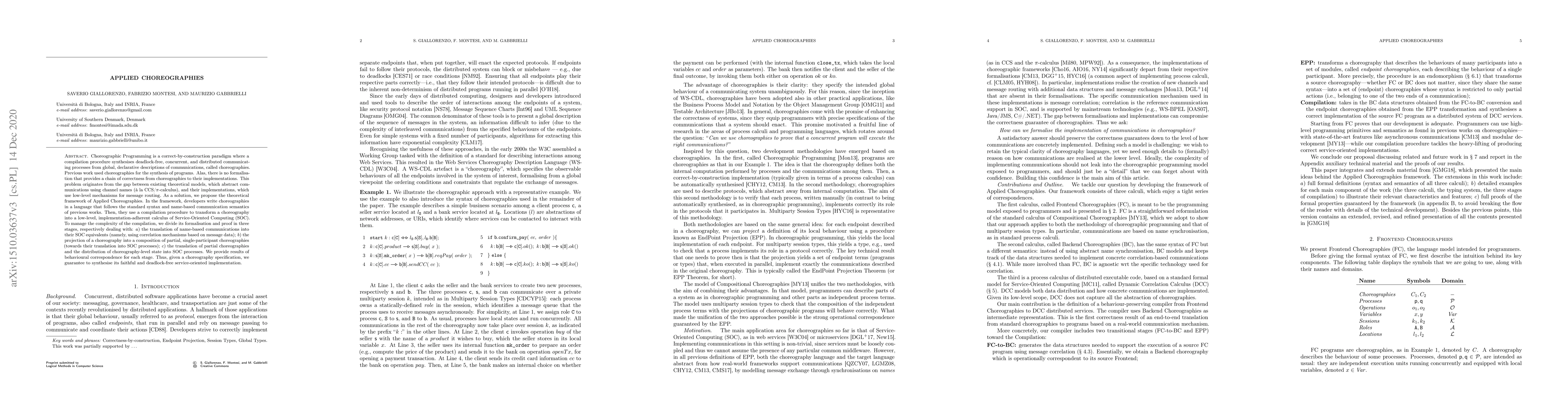Choreographic Programming is a correct-by-construction paradigm where a compilation procedure synthesises deadlock-free, concurrent, and distributed communicating processes from global, declarative descriptions of communications, called choreographies. Previous work used choreographies for the synthesis of programs. Alas, there is no formalisation that provides a chain of correctness from choreographies to their implementations. This problem originates from the gap between existing theoretical models, which abstract communications using channel names (\`a la CCS/{\pi}-calculus), and their implementations, which use low-level mechanisms for message routing. As a solution, we propose the theoretical framework of Applied Choreographies. In the framework, developers write choreographies in a language that follows the standard syntax and name-based communication semantics of previous works. Then, they use a compilation procedure to transform a choreography into a low-level, implementation-adherent calculus of Service-Oriented Computing (SOC). To manage the complexity of the compilation, we divide its formalisation and proof in three stages, respectively dealing with: a) the translation of name-based communications into their SOC equivalents (namely, using correlation mechanisms based on message data); b) the projection of a choreography into a composition of partial, single-participant choreographies (towards their translation into SOC processes); c) the translation of partial choreographies and the distribution of choreography-level state into SOC processes. We provide results of behavioural correspondence for each stage. Thus, given a choreography specification, we guarantee to synthesise its faithful and deadlock-free service-oriented implementation.