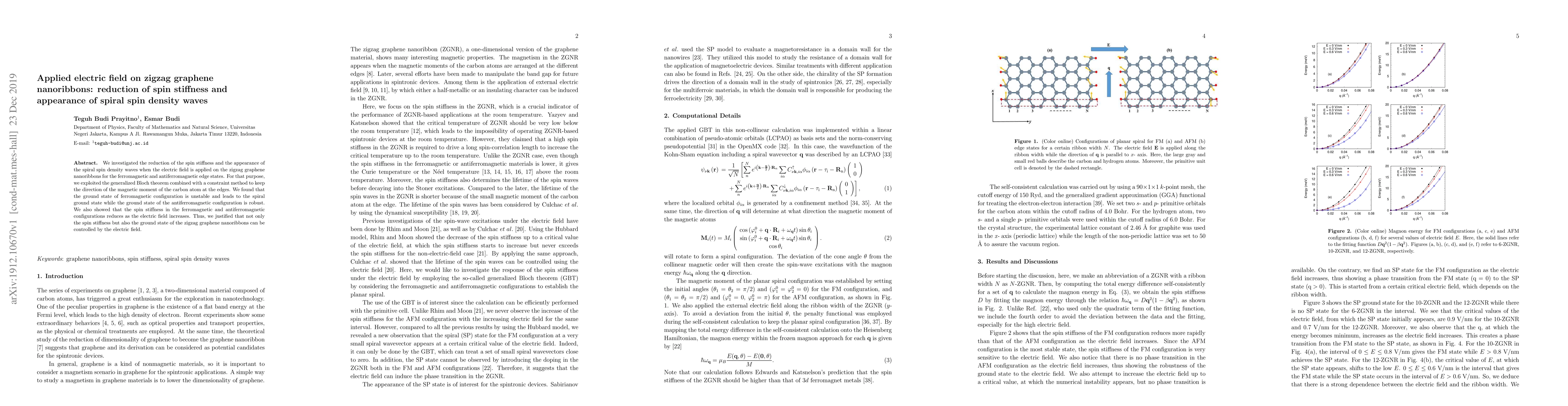 This study reveals that applied electric fields can reduce spin stiffness and induce spiral spin density waves in zigzag graphene nanoribbons, with ferromagnetic edge states transitioning to a spiral ground state while antiferromagnetic states remain stable. The findings demonstrate that electric fields can control both spin stiffness and ground state configurations in these nanoribbons.