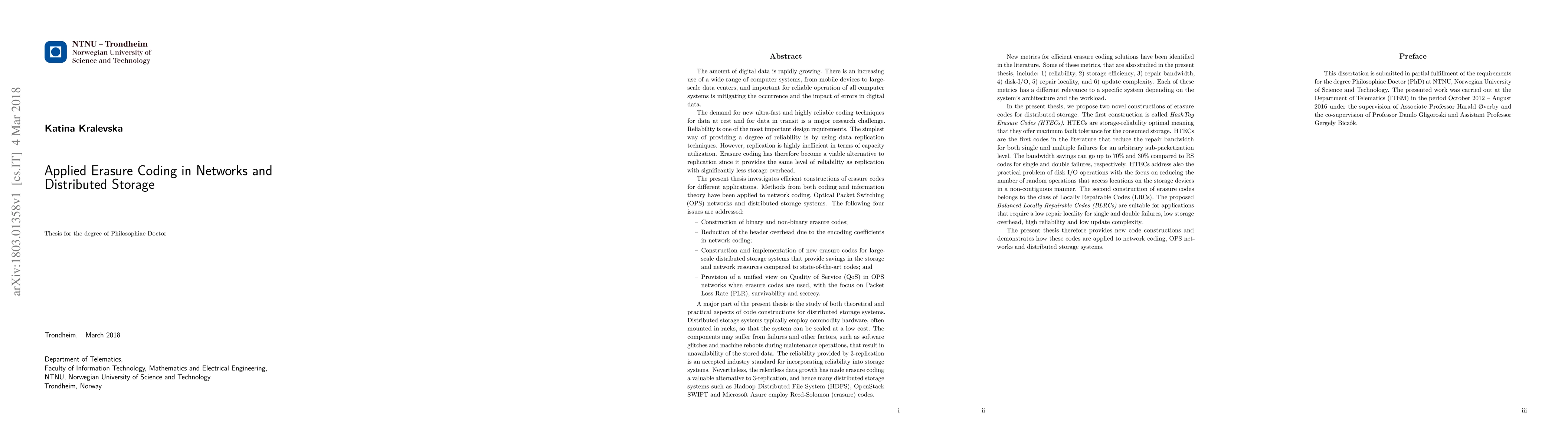 This paper explores efficient erasure coding techniques to enhance data reliability in networks and distributed storage systems, addressing binary and non-binary code constructions, header overhead reduction, and new code implementations for large-scale storage systems. It also examines Quality of Service in Optical Packet Switching networks using erasure codes.
