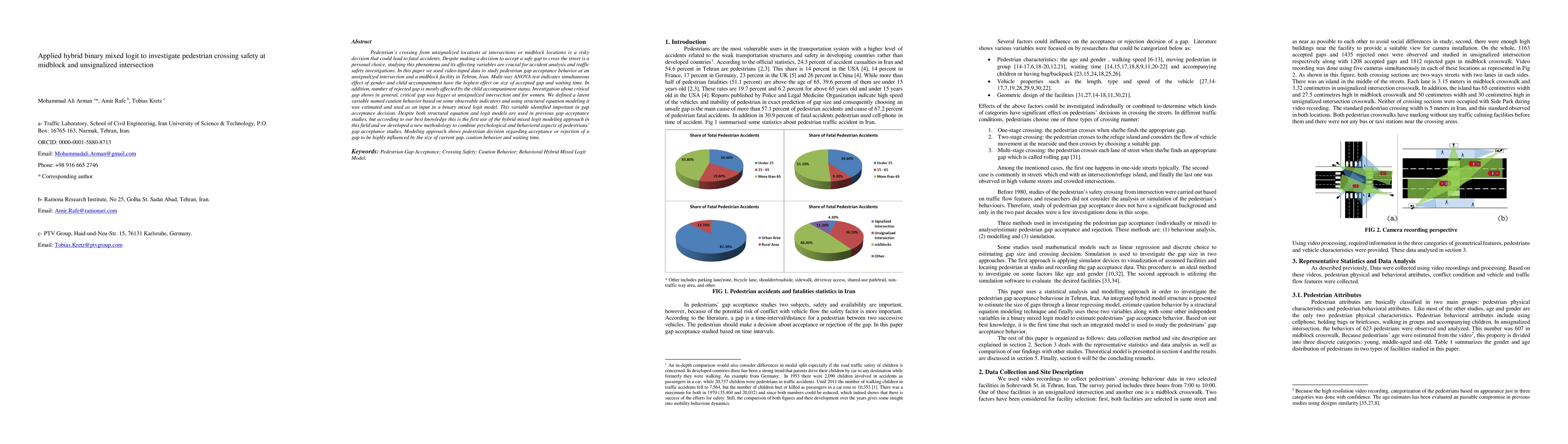 This study employs hybrid binary mixed logit modeling to analyze pedestrian crossing safety at unsignalized intersections and midblock locations in Tehran, Iran. The research finds that gender and child accompaniment significantly affect pedestrian gap acceptance behavior, with caution behavior identified as an important factor in decision-making.