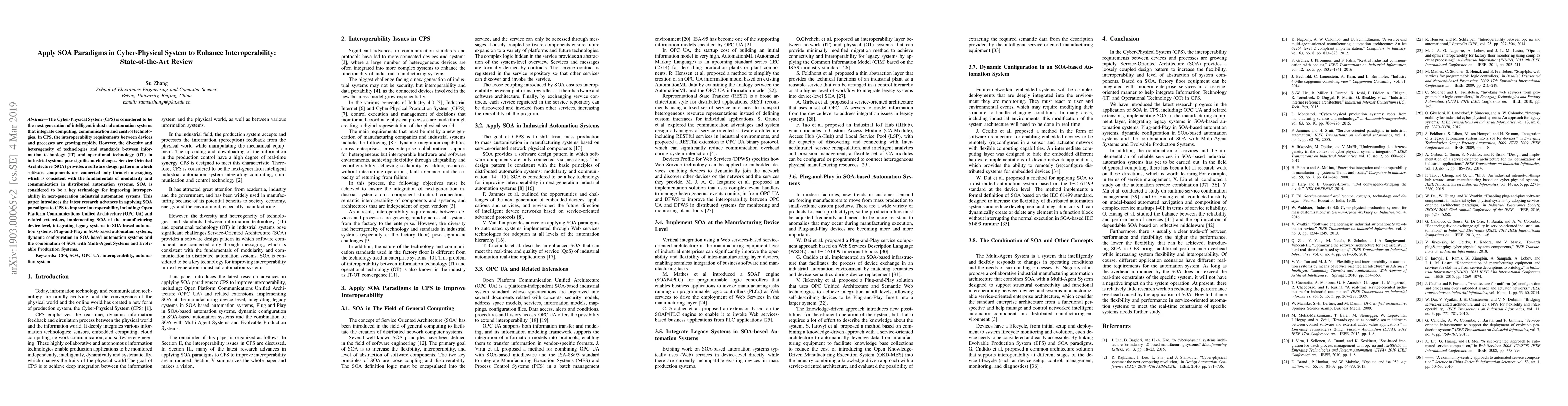 The Cyber-Physical System (CPS) is considered to be the next generation of intelligent industrial automation systems that integrate computing, communication and control technologies. In CPS, the interoperability requirements between devices and processes are growing rapidly. However, the diversity and heterogeneity of technologies and standards between information technology (IT) and operational technology (OT) in industrial systems pose significant challenges. Service-Oriented Architecture (SOA) provides a software design pattern in which software components are connected only through messaging, which is consistent with the fundamentals of modularity and communication in distributed automation systems. SOA is considered to be a key technology for improving interoperability in next-generation industrial automation systems. This paper introduces the latest research advances in applying SOA paradigms to CPS to improve interoperability, including: Open Platform Communications Unified Architecture (OPC UA) and related extensions, implementing SOA at the manufacturing device level, integrating legacy systems in SOA-based automation systems, Plug-and-Play in SOA-based automation systems, dynamic configuration in SOA-based automation systems and the combination of SOA with Multi-Agent Systems and Evolvable Production Systems.