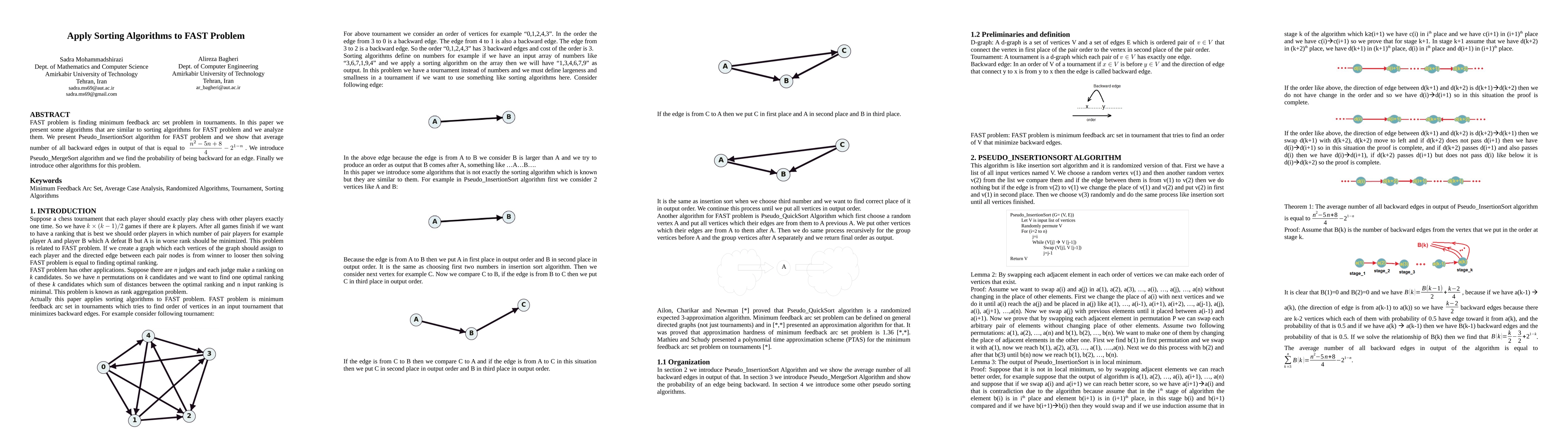 This paper proposes sorting-based algorithms, namely Pseudo_InsertionSort and Pseudo_MergeSort, to tackle the minimum feedback arc set problem in tournaments (FAST problem). The study finds an average number of backward edges in the Pseudo_InsertionSort output and analyzes the probability of an edge being backward in Pseudo_MergeSort.