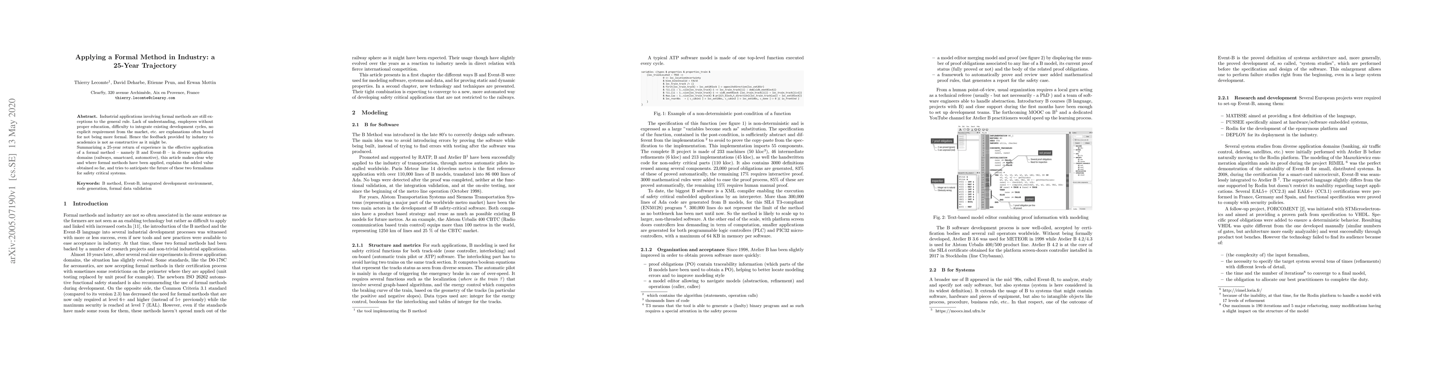 Industrial applications involving formal methods are still exceptions to the general rule. Lack of understanding, employees without proper education, difficulty to integrate existing development cycles, no explicit requirement from the market, etc. are explanations often heard for not being more formal. Hence the feedback provided by industry to academics is not as constructive as it might be. Summarizing a 25-year return of experience in the effective application of a formal method - namely B and Event-B - in diverse application domains (railways, smartcard, automotive), this article makes clear why and where formal methods have been applied, explains the added value obtained so far, and tries to anticipate the future of these two formalisms for safety critical systems.