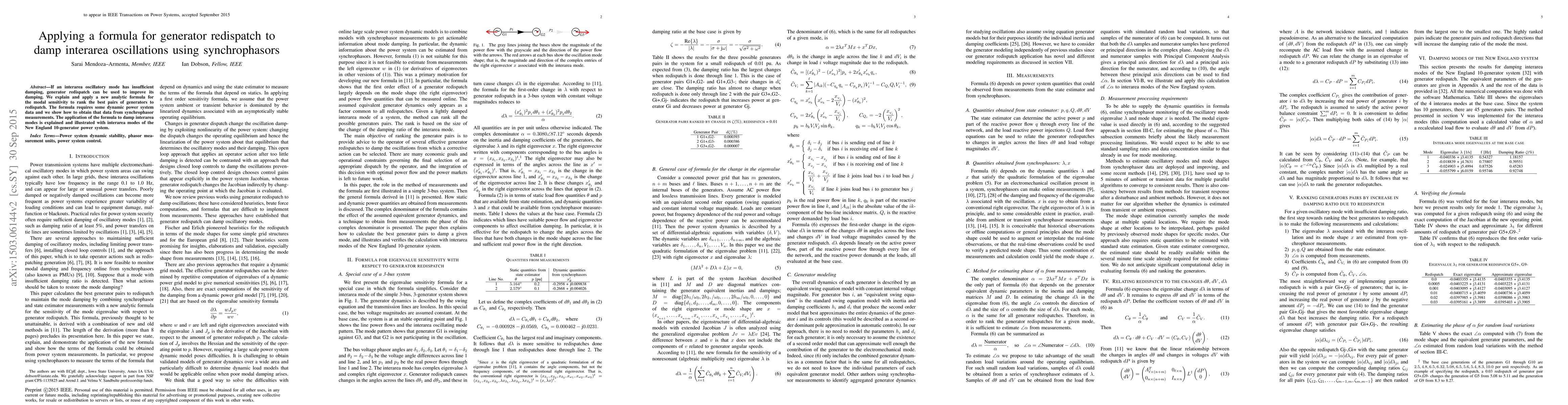 If an interarea oscillatory mode has insufficient damping, generator redispatch can be used to improve its damping. We explain and apply a new analytic formula for the modal sensitivity to rank the best pairs of generators to redispatch. The formula requires some dynamic power system data and we show how to obtain that data from synchrophasor measurements. The application of the formula to damp interarea modes is explained and illustrated with interarea modes of the New England 10-machine power system.