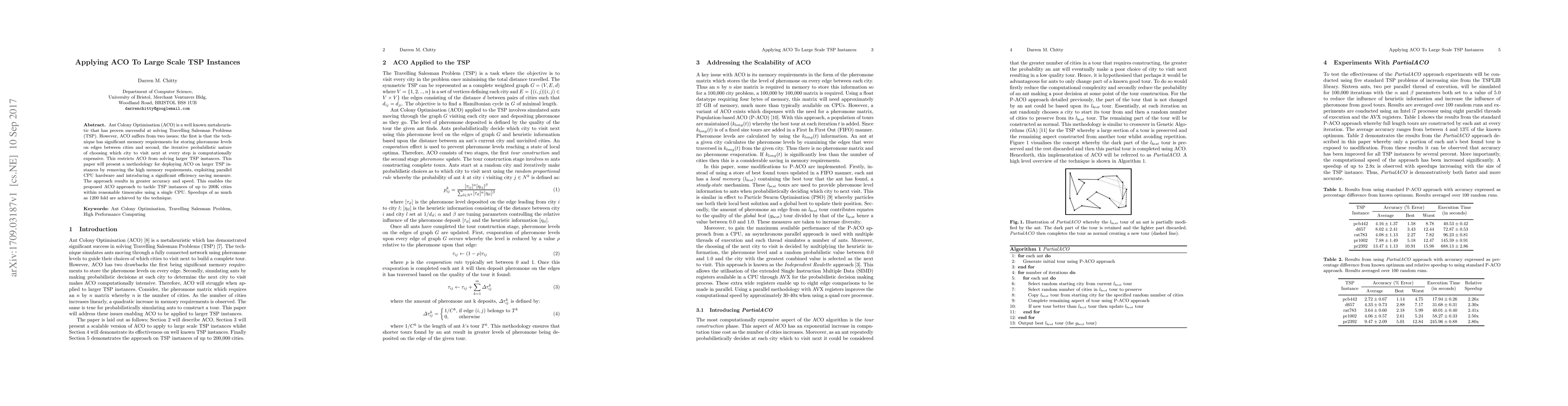 Ant Colony Optimisation (ACO) is a well known metaheuristic that has proven successful at solving Travelling Salesman Problems (TSP). However, ACO suffers from two issues; the first is that the technique has significant memory requirements for storing pheromone levels on edges between cities and second, the iterative probabilistic nature of choosing which city to visit next at every step is computationally expensive. This restricts ACO from solving larger TSP instances. This paper will present a methodology for deploying ACO on larger TSP instances by removing the high memory requirements, exploiting parallel CPU hardware and introducing a significant efficiency saving measure. The approach results in greater accuracy and speed. This enables the proposed ACO approach to tackle TSP instances of up to 200K cities within reasonable timescales using a single CPU. Speedups of as much as 1200 fold are achieved by the technique.
