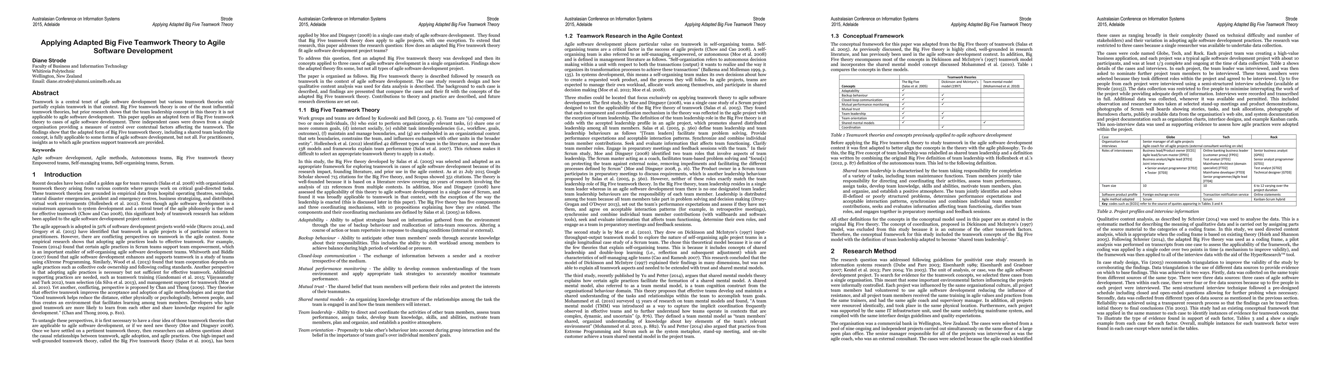 This paper adapts the Big Five teamwork theory for agile software development, finding that while the shared team leadership concept is applicable to some agile practices, it does not universally fit. The study provides practical insights for practitioners on which agile practices enhance teamwork.