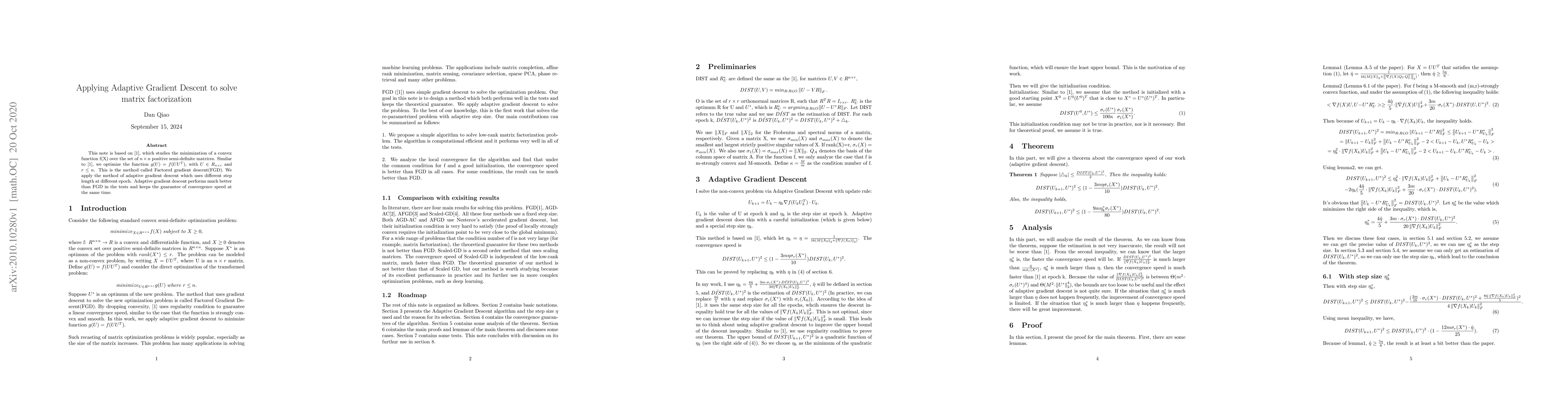Summary: This paper applies adaptive gradient descent to matrix factorization, showing improved performance over fixed gradient descent (FGD) while maintaining convergence speed. The adaptive method uses varying step lengths per epoch, enhancing overall efficiency.