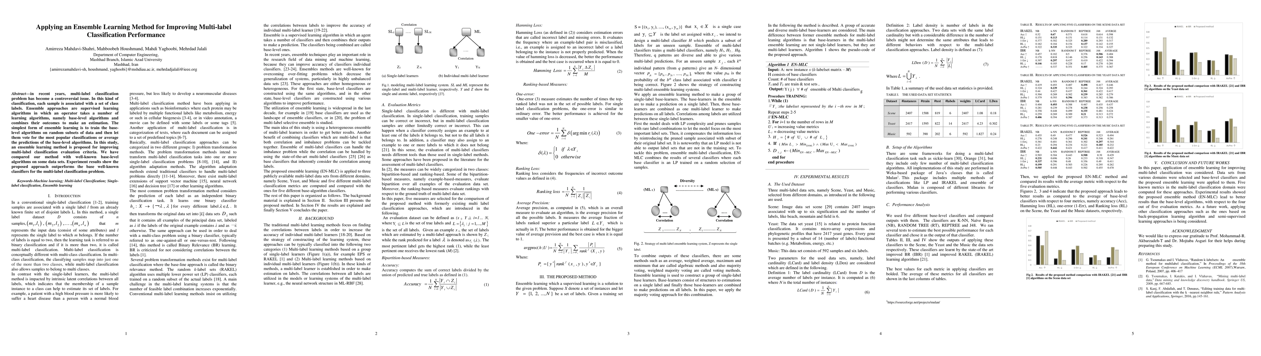 In recent years, multi-label classification problem has become a controversial issue. In this kind of classification, each sample is associated with a set of class labels. Ensemble approaches are supervised learning algorithms in which an operator takes a number of learning algorithms, namely base-level algorithms and combines their outcomes to make an estimation. The simplest form of ensemble learning is to train the base-level algorithms on random subsets of data and then let them vote for the most popular classifications or average the predictions of the base-level algorithms. In this study, an ensemble learning method is proposed for improving multi-label classification evaluation criteria. We have compared our method with well-known base-level algorithms on some data sets. Experiment results show the proposed approach outperforms the base well-known classifiers for the multi-label classification problem.