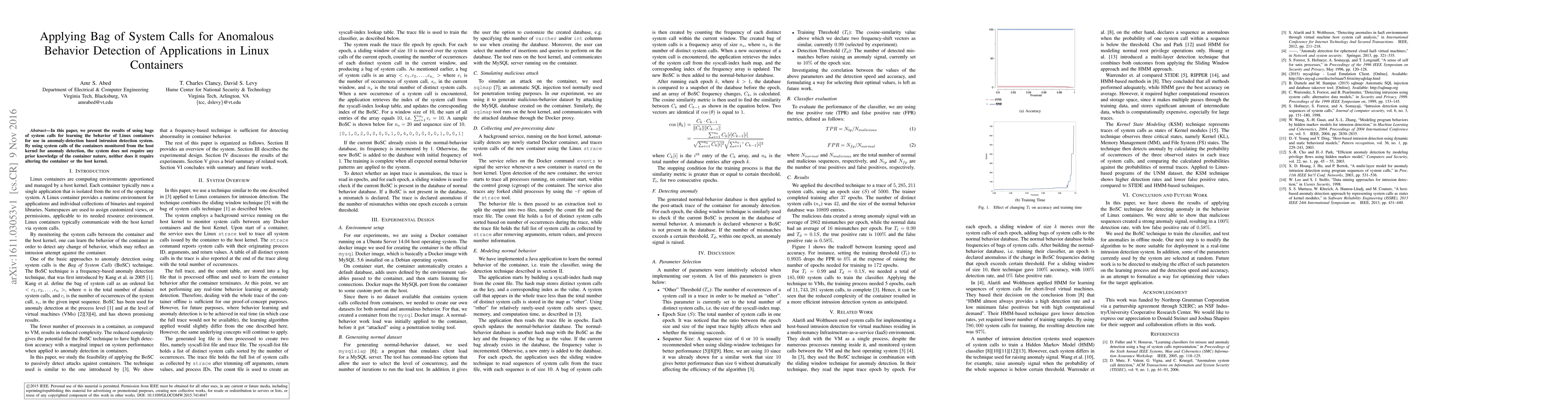This paper explores the use of bags of system calls to analyze and detect anomalous behavior in Linux containers, aiming to develop an intrusion detection system that does not require prior knowledge of container specifics or modifications to the container or host kernel.
