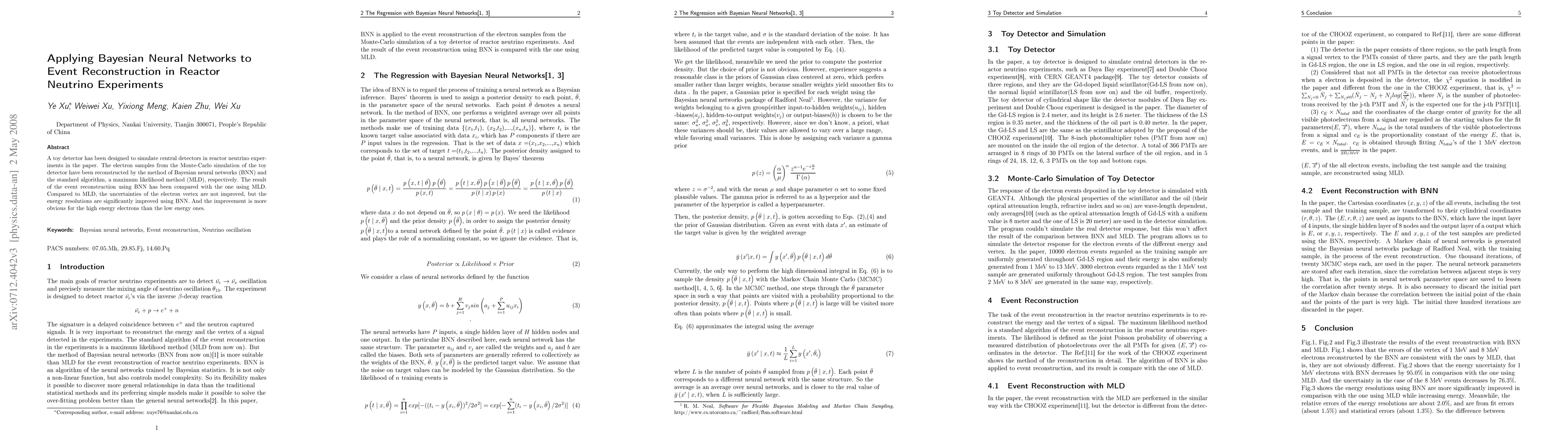 A toy detector has been designed to simulate central detectors in reactor neutrino experiments in the paper. The electron samples from the Monte-Carlo simulation of the toy detector have been reconstructed by the method of Bayesian neural networks (BNN) and the standard algorithm, a maximum likelihood method (MLD), respectively. The result of the event reconstruction using BNN has been compared with the one using MLD. Compared to MLD, the uncertainties of the electron vertex are not improved, but the energy resolutions are significantly improved using BNN. And the improvement is more obvious for the high energy electrons than the low energy ones.