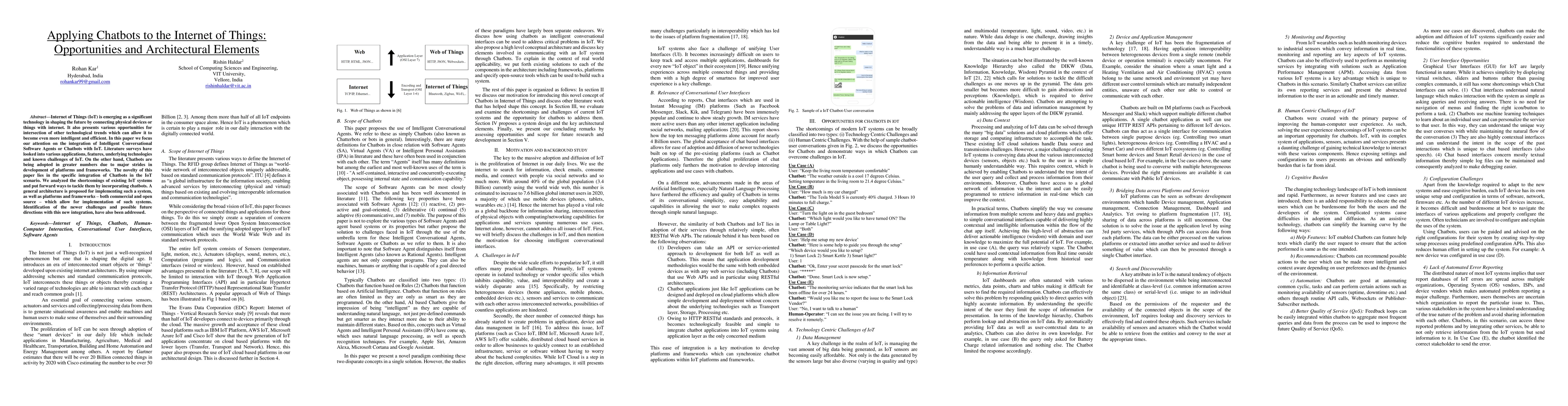 Internet of Things (IoT) is emerging as a significant technology in shaping the future by connecting physical devices or things with internet. It also presents various opportunities for intersection of other technological trends which can allow it to become even more intelligent and efficient. In this paper we focus our attention on the integration of Intelligent Conversational Software Agents or Chatbots with IoT. Literature surveys have looked into various applications, features, underlying technologies and known challenges of IoT. On the other hand, Chatbots are being adopted in greater numbers due to major strides in development of platforms and frameworks. The novelty of this paper lies in the specific integration of Chatbots in the IoT scenario. We analyzed the shortcomings of existing IoT systems and put forward ways to tackle them by incorporating chatbots. A general architecture is proposed for implementing such a system, as well as platforms and frameworks, both commercial and open source, which allow for implementation of such systems. Identification of the newer challenges and possible future directions with this new integration, have also been addressed.