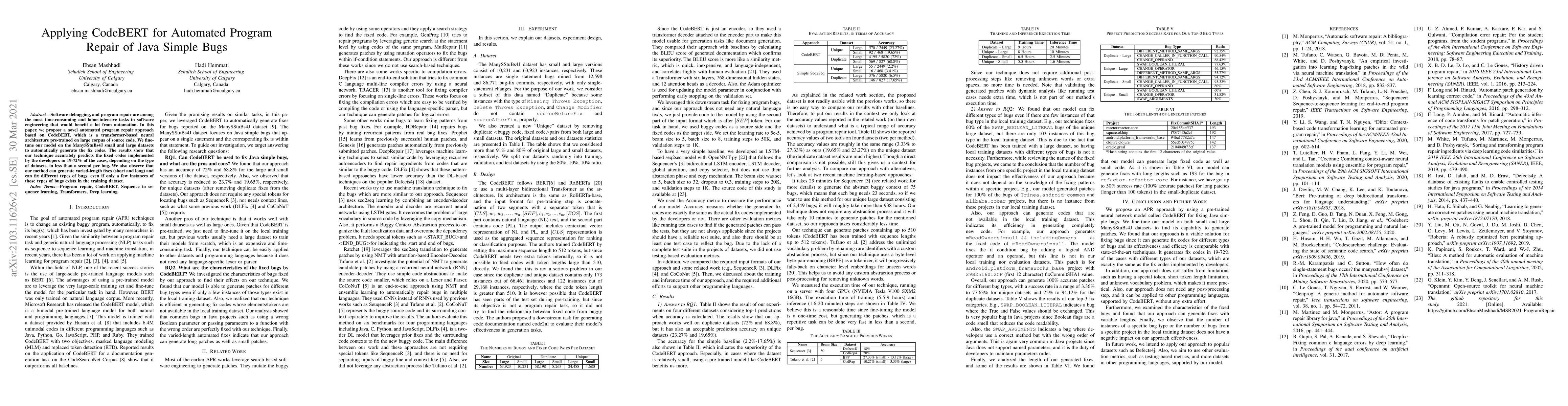 This paper proposes an automated program repair method using CodeBERT to fix simple Java bugs, achieving accurate predictions in 19-72% of cases, generating varied-length fixes, and handling different bug types with minimal training data.