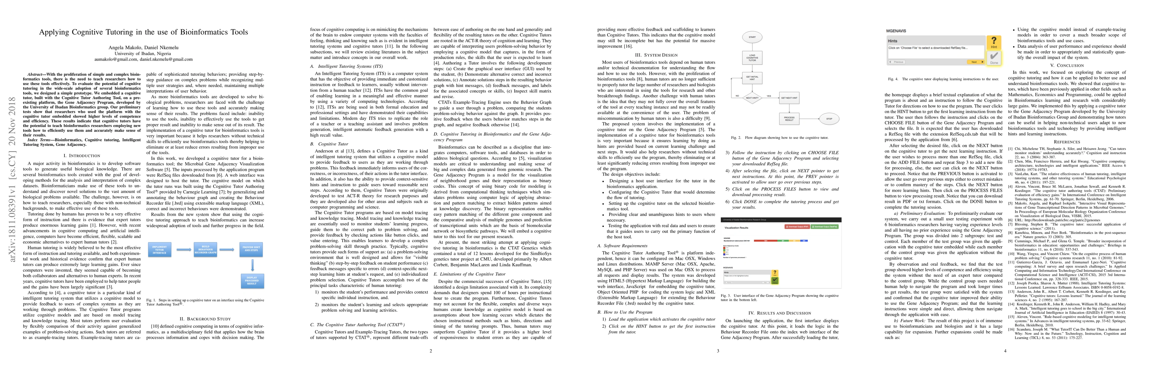 With the proliferation of simple and complex bioinformatics tools, there is the need to teach researchers how to use these tools effectively. To evaluate the potential of cognitive tutoring in the wide-scale adoption of several bioinformatics tools, we designed a simple prototype. We embedded a cognitive tutor, built with the Cognitive Tutor Authoring Tool, on a preexisting platform, the Gene Adjacency Program, developed by the University of Ibadan Bioinformatics group. Our preliminary tests show that researchers who used the platform with the cognitive tutor embedded showed higher levels of competence and efficiency. These results indicate that cognitive tutors have the potential to teach bioinformatics researchers employing new tools how to efficiently use them and accurately make sense of their results.