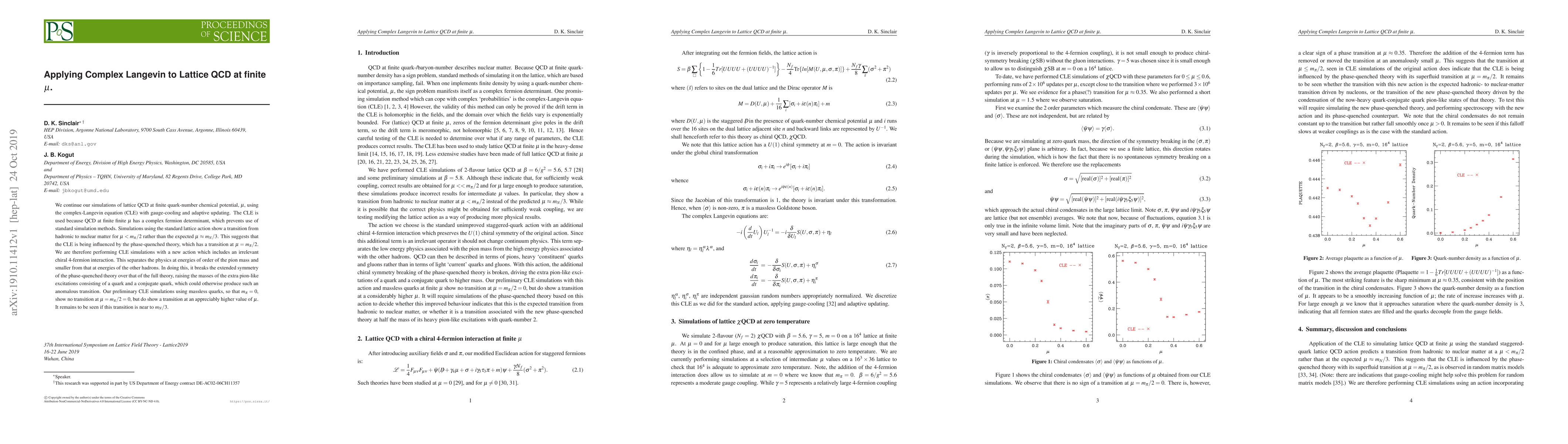 We continue our simulations of lattice QCD at finite quark-number chemical potential, $\mu$, using the complex-Langevin equation (CLE) with gauge-cooling and adaptive updating. The CLE is used because QCD at finite finite $\mu$ has a complex fermion determinant, which prevents use of standard simulation methods. Simulations using the standard lattice action show a transition from hadronic to nuclear matter for $\mu < m_\pi/2$ rather than the expected $\mu \approx m_N/3$. This suggests that the CLE is being influenced by the phase-quenched theory, which has a transition at $\mu = m_\pi/2$. We are therefore performing CLE simulations with a new action which includes an irrelevant chiral 4-fermion interaction. This separates the physics at energies of order of the pion mass and smaller from that at energies of the other hadrons. In doing this, it breaks the extended symmetry of the phase-quenched theory over that of the full theory, raising the masses of the extra pion-like excitations consisting of a quark and a conjugate quark, which could otherwise produce such an anomalous transition. Our preliminary CLE simulations using massless quarks, so that $m_\pi=0$, show no transition at $\mu=m_\pi/2=0$, but do show a transition at an appreciably higher value of $\mu$. It remains to be seen if this transition is near to $m_N/3$.