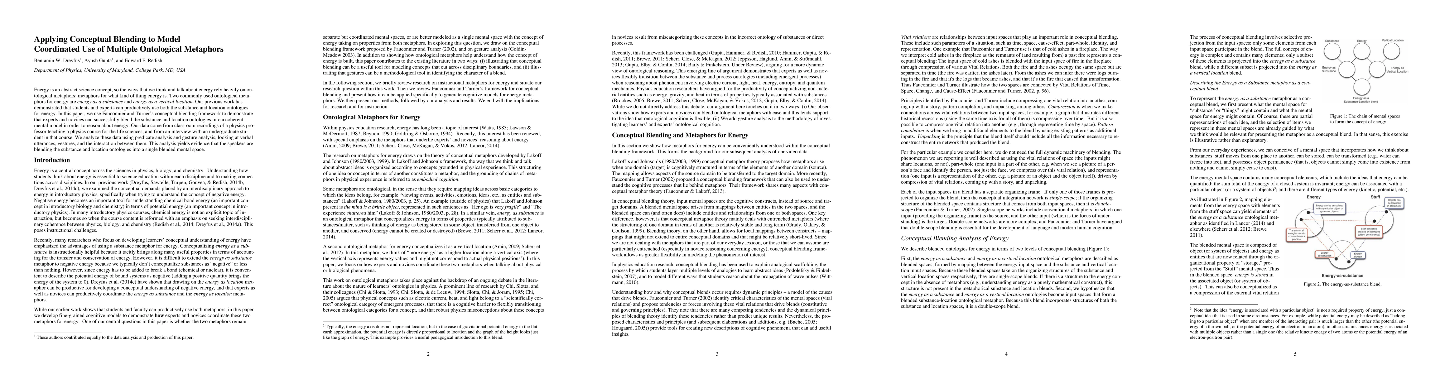 This paper uses conceptual blending to show how experts and novices integrate multiple ontological metaphors for energy, specifically the substance and vertical location metaphors, into a coherent mental model. Data from classroom interactions and interviews reveal that blending these metaphors aids in reasoning about energy.