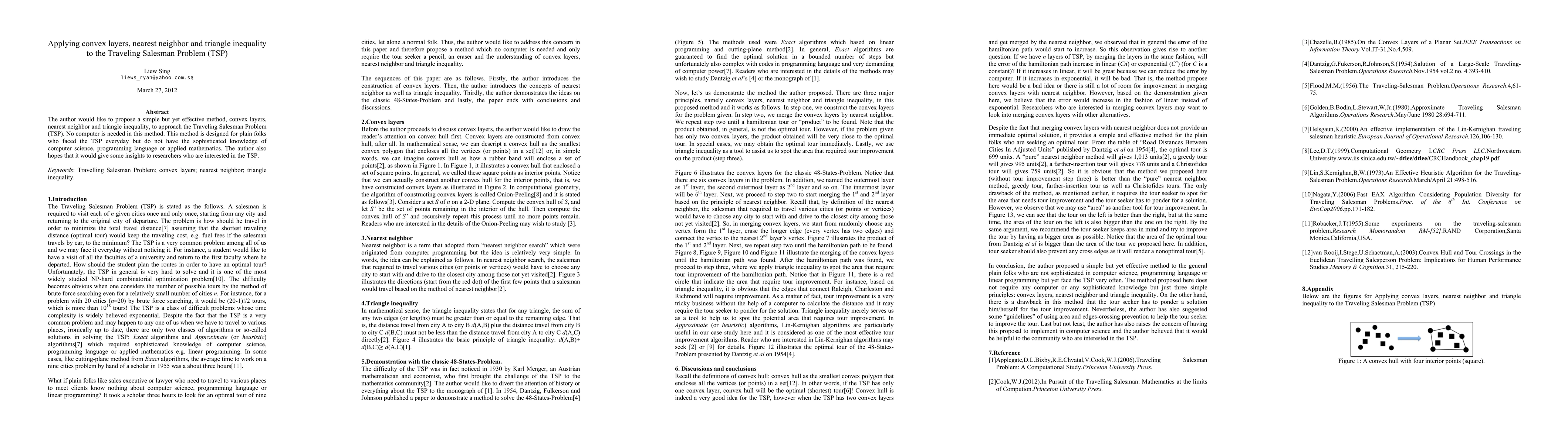 The author would like to propose a simple but yet effective method, convex layers, nearest neighbor and triangle inequality, to approach the Traveling Salesman Problem (TSP). No computer is needed in this method. This method is designed for plain folks who faced the TSP everyday but do not have the sophisticated knowledge of computer science, programming language or applied mathematics. The author also hopes that it would give some insights to researchers who are interested in the TSP.