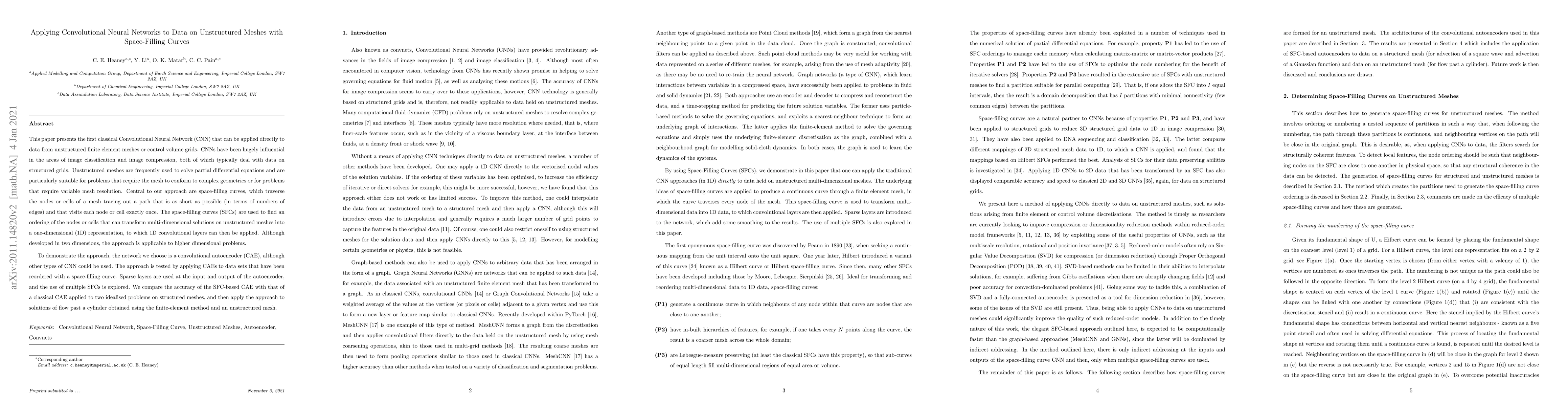 This paper introduces a classical Convolutional Neural Network (CNN) that applies to unstructured meshes using space-filling curves to transform multi-dimensional data into a 1D representation, enabling 1D convolutional layers. The method is demonstrated using convolutional autoencoders on various datasets, showing its effectiveness for problems requiring complex geometries.