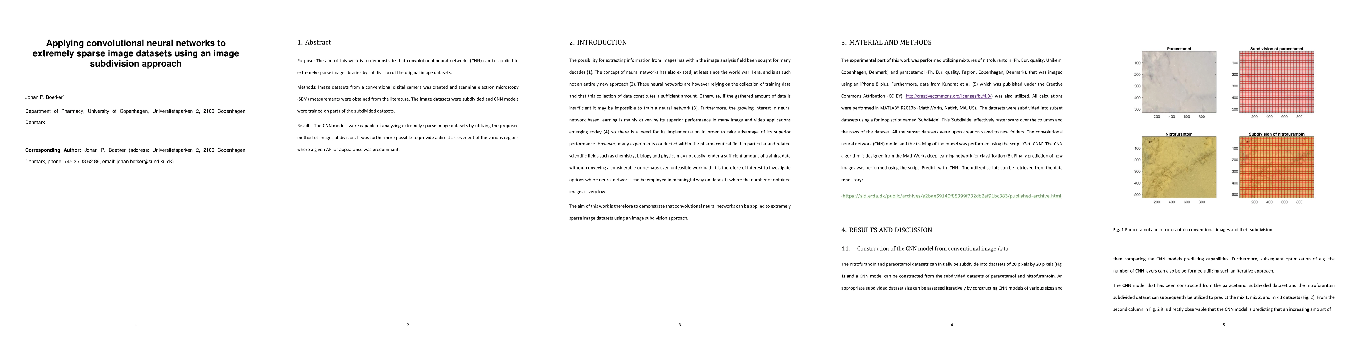 Purpose: The aim of this work is to demonstrate that convolutional neural networks (CNN) can be applied to extremely sparse image libraries by subdivision of the original image datasets. Methods: Image datasets from a conventional digital camera was created and scanning electron microscopy (SEM) measurements were obtained from the literature. The image datasets were subdivided and CNN models were trained on parts of the subdivided datasets. Results: The CNN models were capable of analyzing extremely sparse image datasets by utilizing the proposed method of image subdivision. It was furthermore possible to provide a direct assessment of the various regions where a given API or appearance was predominant.