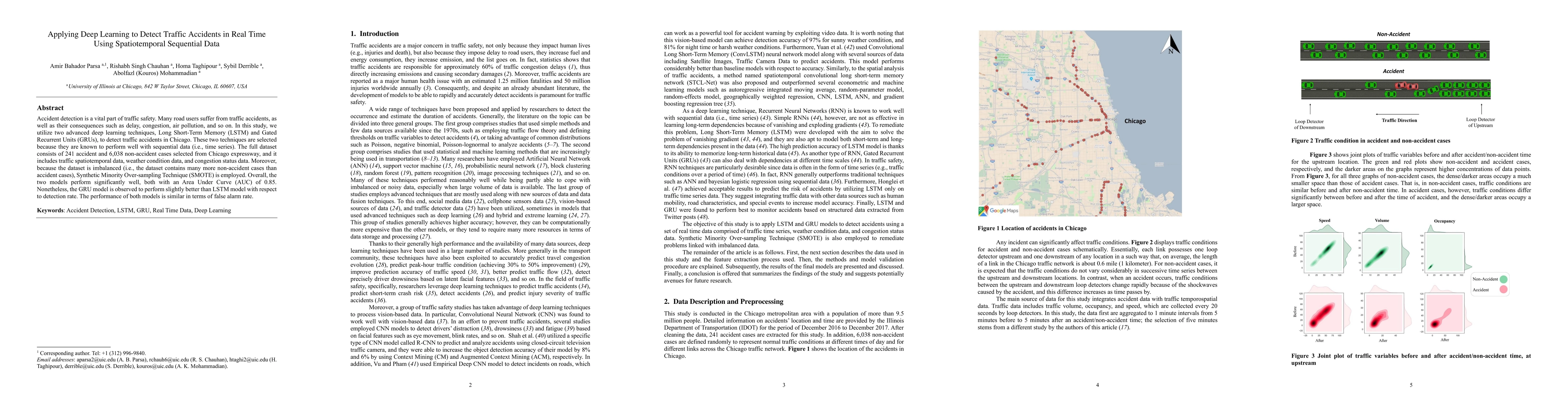This study applies LSTM and GRU deep learning techniques to detect traffic accidents in real time using spatiotemporal sequential data from Chicago expressways. Despite dataset imbalance, both models achieve an AUC of 0.85, with GRU showing a slightly better detection rate.