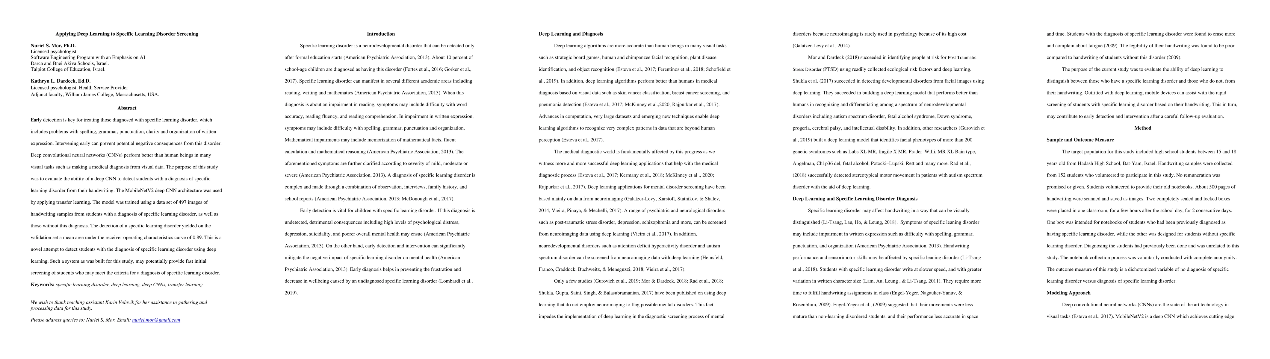 This study evaluates a deep convolutional neural network (MobileNetV2) for early detection of specific learning disorder through handwriting analysis, achieving a mean AUC of 0.89 on validation. The proposed system could offer a fast initial screening tool for identifying students potentially needing further diagnosis.