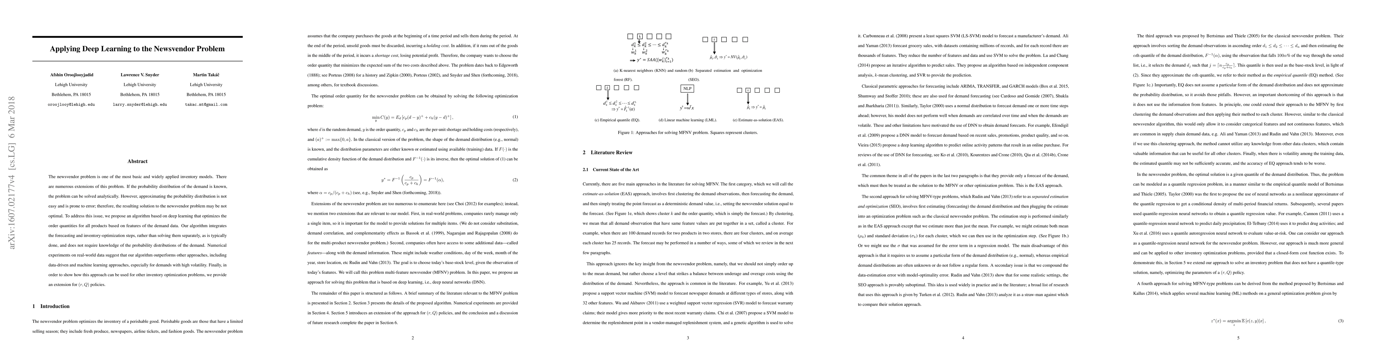 The newsvendor problem is one of the most basic and widely applied inventory models. There are numerous extensions of this problem. If the probability distribution of the demand is known, the problem can be solved analytically. However, approximating the probability distribution is not easy and is prone to error; therefore, the resulting solution to the newsvendor problem may be not optimal. To address this issue, we propose an algorithm based on deep learning that optimizes the order quantities for all products based on features of the demand data. Our algorithm integrates the forecasting and inventory-optimization steps, rather than solving them separately, as is typically done, and does not require knowledge of the probability distributions of the demand. Numerical experiments on real-world data suggest that our algorithm outperforms other approaches, including data-driven and machine learning approaches, especially for demands with high volatility. Finally, in order to show how this approach can be used for other inventory optimization problems, we provide an extension for (r,Q) policies.