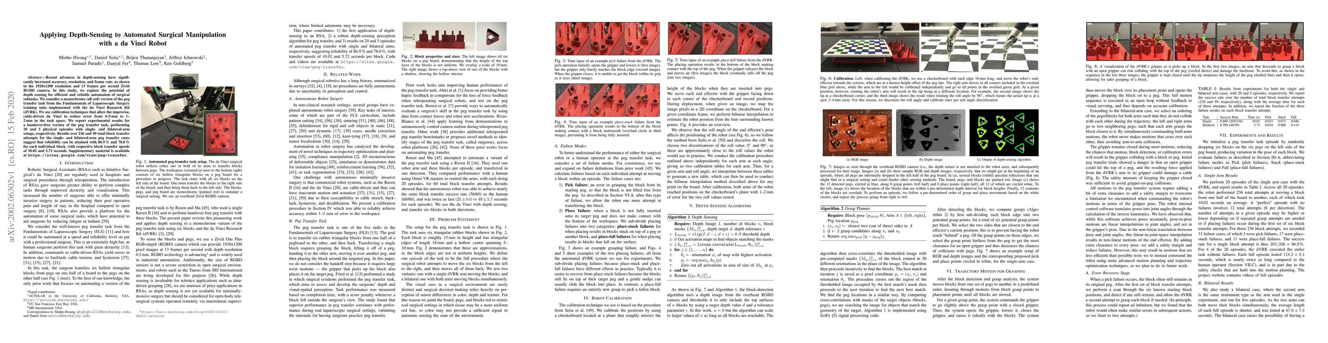 Recent advances in depth-sensing have significantly increased accuracy, resolution, and frame rate, as shown in the 1920x1200 resolution and 13 frames per second Zivid RGBD camera. In this study, we explore the potential of depth sensing for efficient and reliable automation of surgical subtasks. We consider a monochrome (all red) version of the peg transfer task from the Fundamentals of Laparoscopic Surgery training suite implemented with the da Vinci Research Kit (dVRK). We use calibration techniques that allow the imprecise, cable-driven da Vinci to reduce error from 4-5 mm to 1-2 mm in the task space. We report experimental results for a handover-free version of the peg transfer task, performing 20 and 5 physical episodes with single- and bilateral-arm setups, respectively. Results over 236 and 49 total block transfer attempts for the single- and bilateral-arm peg transfer cases suggest that reliability can be attained with 86.9 % and 78.0 % for each individual block, with respective block transfer speeds of 10.02 and 5.72 seconds. Supplementary material is available at https://sites.google.com/view/peg-transfer.