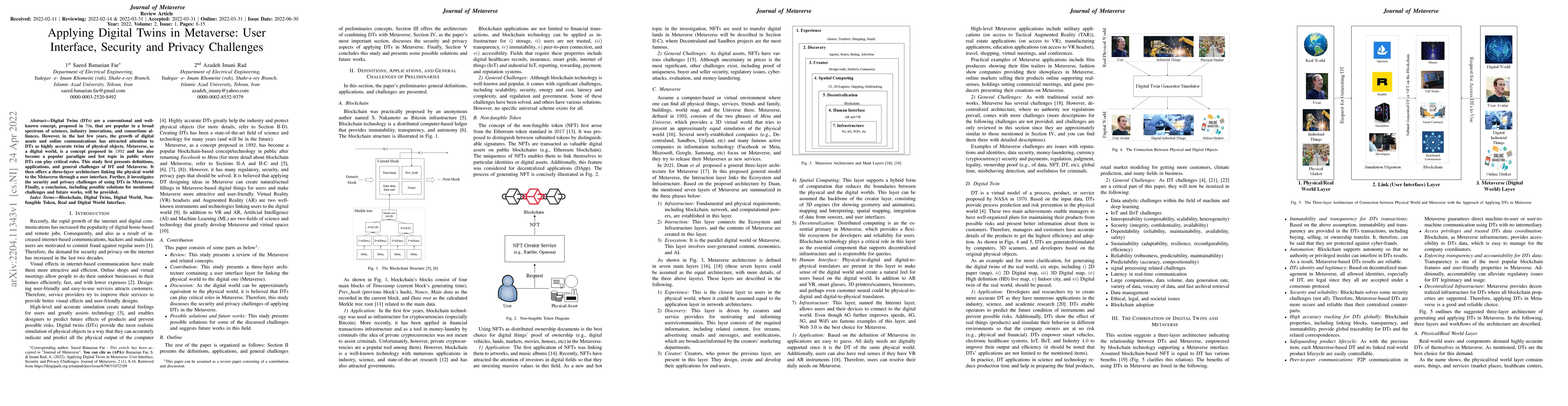 Digital Twins (DTs) are a conventional and well-known concept, proposed in 70s, that are popular in a broad spectrum of sciences, industry innovations, and consortium alliances. However, in the last few years, the growth of digital assets and online communications has attracted attention to DTs as highly accurate twins of physical objects. Metaverse, as a digital world, is a concept proposed in 1992 and has also become a popular paradigm and hot topic in public where DTs can play critical roles. This study first presents definitions, applications, and general challenges of DT and Metaverse. It then offers a three-layer architecture linking the physical world to the Metaverse through a user interface. Further, it investigates the security and privacy challenges of using DTs in Metaverse. Finally, a conclusion, including possible solutions for mentioned challenges and future works, will be provided.