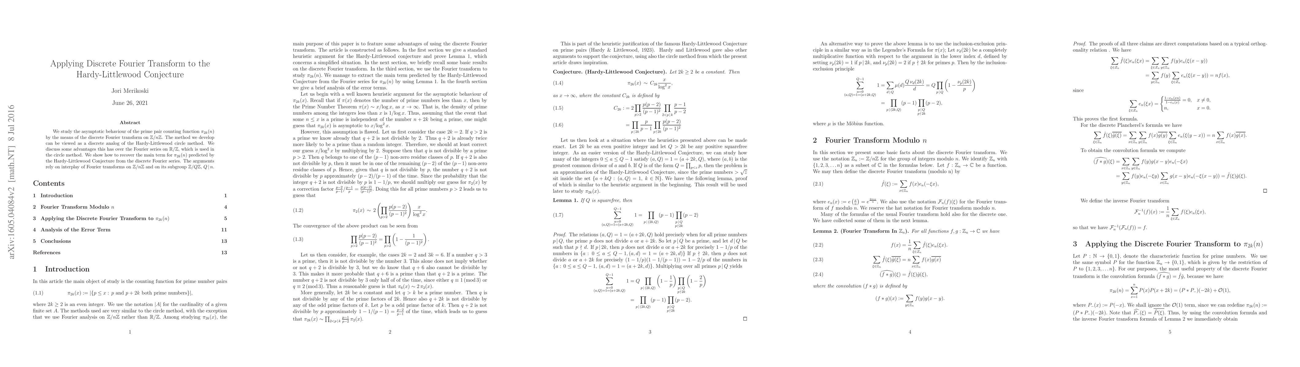 This paper applies the discrete Fourier transform on $\mathbb{Z}/n\mathbb{Z}$ to study the asymptotic behavior of the prime pair counting function $\pi_{2k}(n)$, offering a discrete analog of the Hardy-Littlewood circle method. The method recovers the main term predicted by the Hardy-Littlewood Conjecture, leveraging the interplay between Fourier transforms on $\mathbb{Z}/n\mathbb{Z}$ and its subgroup $\mathbb{Z}/Q\mathbb{Z}$.
