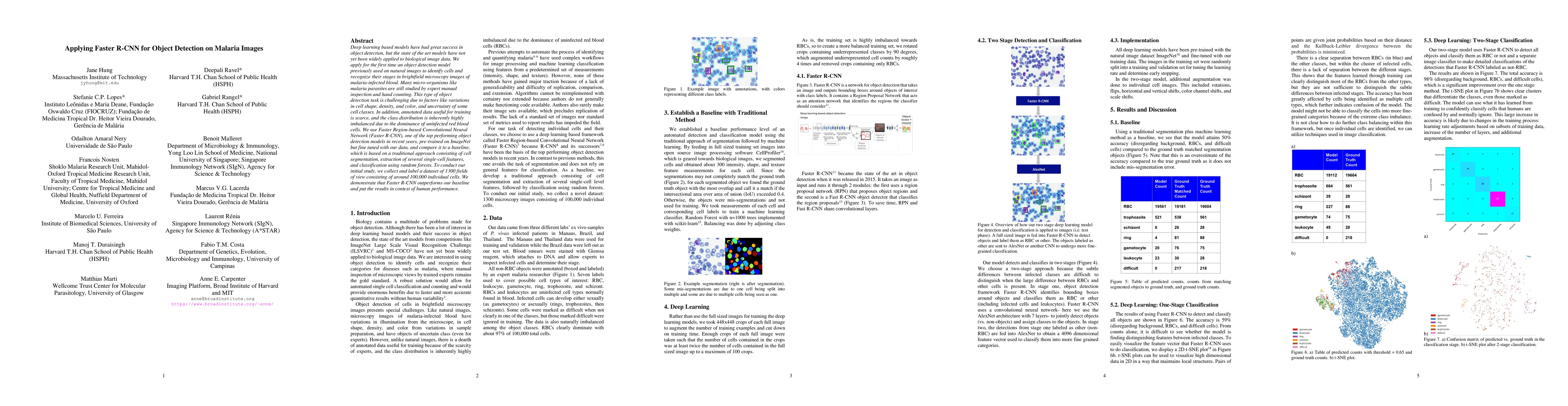 This paper applies Faster R-CNN, a leading object detection model, to identify and stage malaria parasites in microscopy images, addressing the scarcity of annotated data and class imbalance. The results show that Faster R-CNN outperforms traditional methods and compares favorably to human performance.