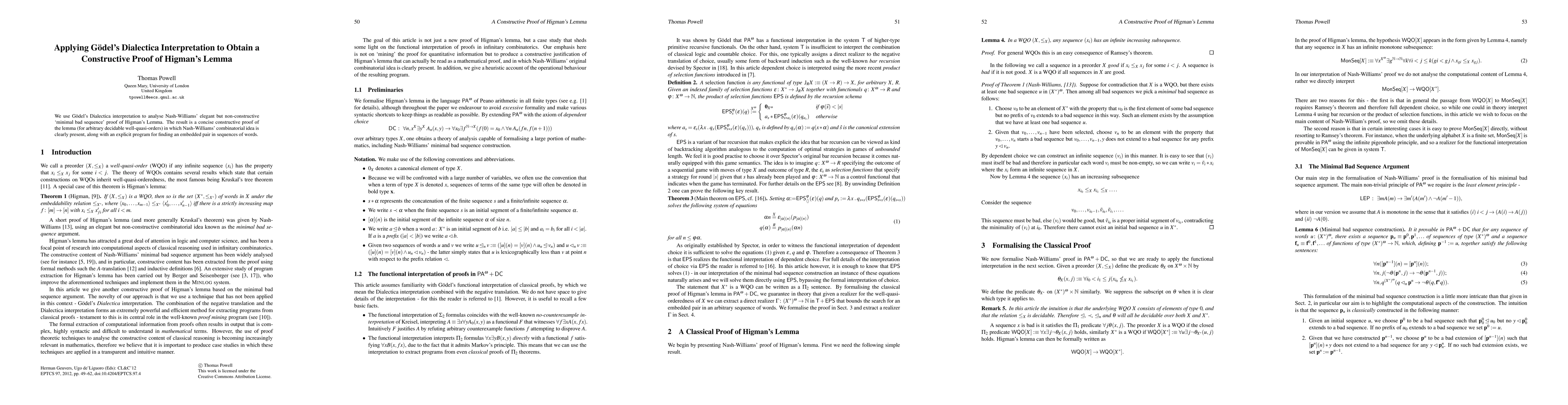 Summary: This paper applies Gödel's Dialectica interpretation to transform Nash-Williams' non-constructive proof of Higman's Lemma into a concise constructive proof, preserving the original combinatorial idea and providing an explicit algorithm for finding embedded pairs in word sequences.