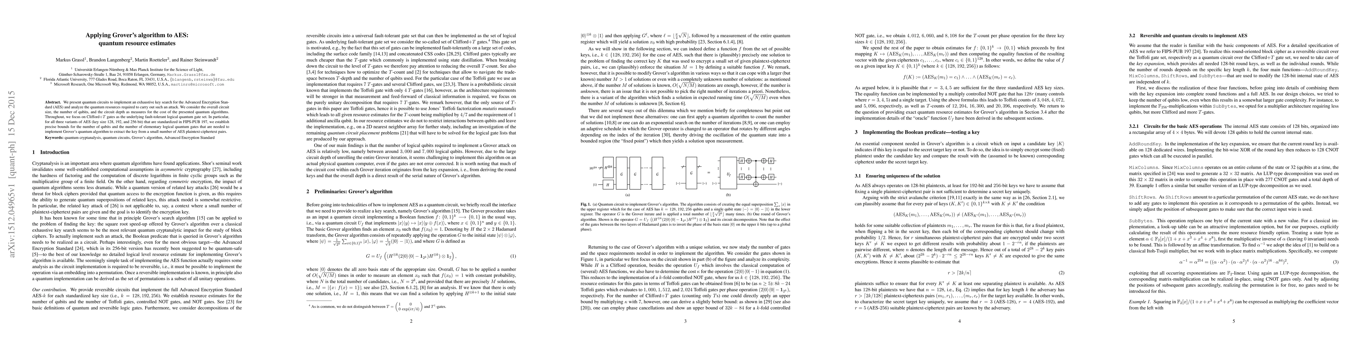 This paper presents quantum circuits for exhaustive key search in AES using Grover's algorithm, analyzing the quantum resources required, including the number of qubits and circuit depth. It establishes precise bounds for the resource estimates for all three AES variants (128, 192, and 256 bits) using Clifford$+T$ gates.
