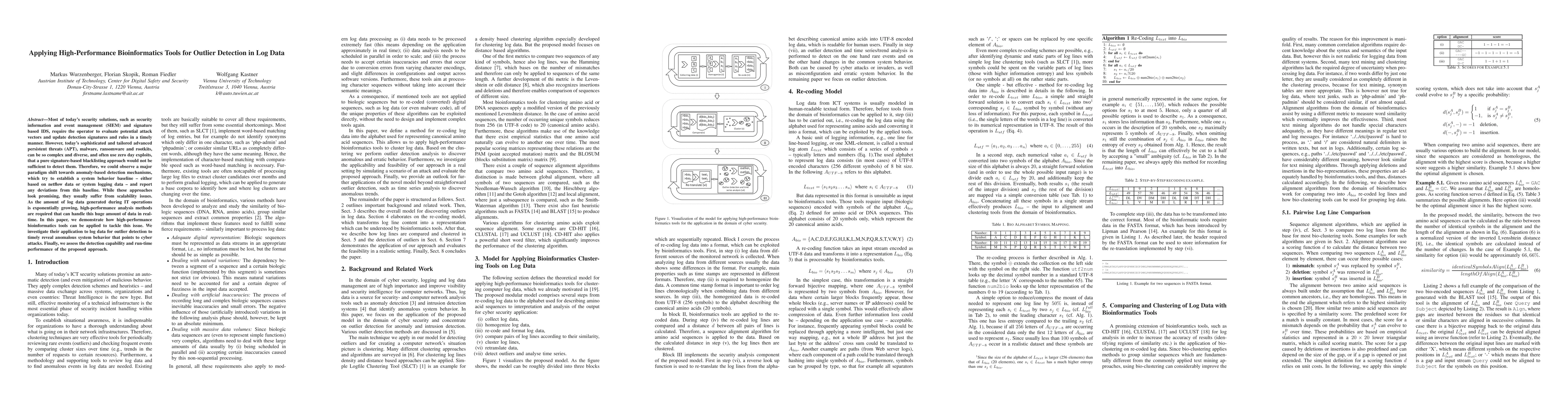 Most of today's security solutions, such as security information and event management (SIEM) and signature based IDS, require the operator to evaluate potential attack vectors and update detection signatures and rules in a timely manner. However, today's sophisticated and tailored advanced persistent threats (APT), malware, ransomware and rootkits, can be so complex and diverse, and often use zero day exploits, that a pure signature-based blacklisting approach would not be sufficient to detect them. Therefore, we could observe a major paradigm shift towards anomaly-based detection mechanisms, which try to establish a system behavior baseline -- either based on netflow data or system logging data -- and report any deviations from this baseline. While these approaches look promising, they usually suffer from scalability issues. As the amount of log data generated during IT operations is exponentially growing, high-performance analysis methods are required that can handle this huge amount of data in real-time. In this paper, we demonstrate how high-performance bioinformatics tools can be applied to tackle this issue. We investigate their application to log data for outlier detection to timely reveal anomalous system behavior that points to cyber attacks. Finally, we assess the detection capability and run-time performance of the proposed approach.