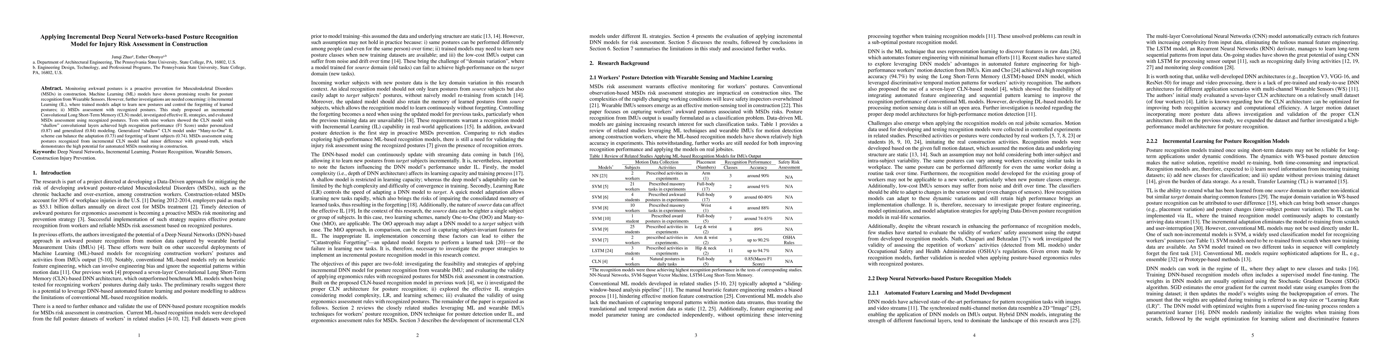Monitoring awkward postures is a proactive prevention for Musculoskeletal Disorders (MSDs)in construction. Machine Learning (ML) models have shown promising results for posture recognition from Wearable Sensors. However, further investigations are needed concerning: i) Incremental Learning (IL), where trained models adapt to learn new postures and control the forgetting of learned postures; ii) MSDs assessment with recognized postures. This study proposed an incremental Convolutional Long Short-Term Memory (CLN) model, investigated effective IL strategies, and evaluated MSDs assessment using recognized postures. Tests with nine workers showed the CLN model with shallow convolutional layers achieved high recognition performance (F1 Score) under personalized (0.87) and generalized (0.84) modeling. Generalized shallow CLN model under Many-to-One IL scheme can balance the adaptation (0.73) and forgetting of learnt subjects (0.74). MSDs assessment using postures recognized from incremental CLN model had minor difference with ground-truth, which demonstrates the high potential for automated MSDs monitoring in construction.