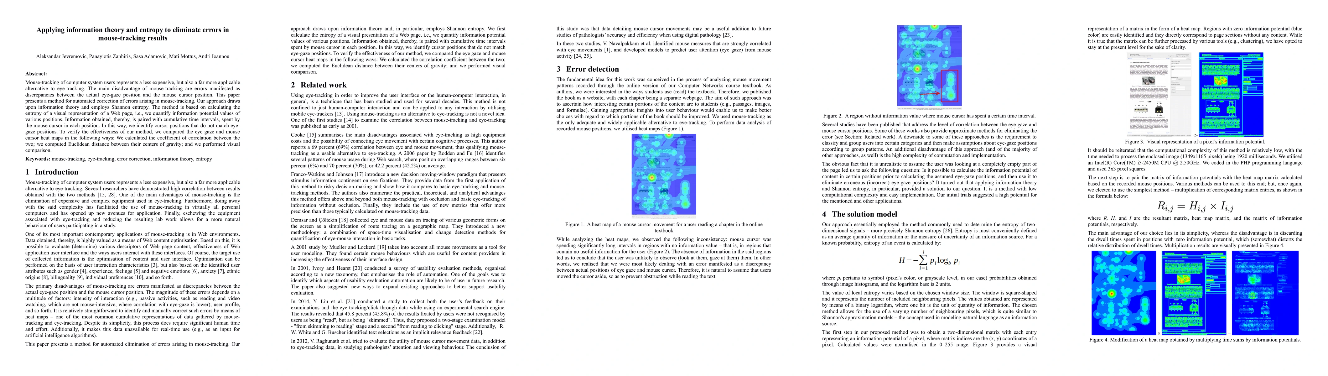 Mouse-tracking of computer system users represents a less expensive, but also a far more applicable alternative to eye-tracking. The main disadvantage of mouse-tracking are errors manifested as discrepancies between the actual eye-gaze position and the mouse cursor position. This paper presents a method for automated correction of errors arising in mouse-tracking. Our approach draws upon information theory and employs Shannon entropy. The method is based on calculating the entropy of a visual representation of a Web page, i.e., we quantify information potential values of various positions. Information obtained, thereby, is paired with cumulative time intervals, spent by the mouse cursor in each position. In this way, we identify cursor positions that do not match eye-gaze positions. To verify the effectiveness of our method, we compared the eye gaze and mouse cursor heat maps in the following ways: We calculated the coefficient of correlation between the two; we computed Euclidean distance between their centers of gravity; and we performed visual comparison.