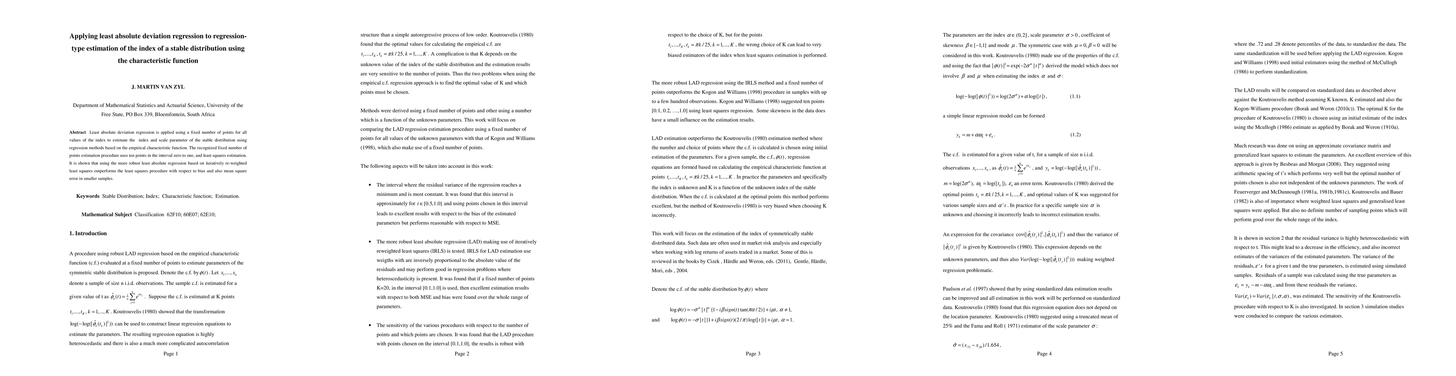 Least absolute deviation regression is applied using a fixed number of points for all values of the index to estimate the index and scale parameter of the stable distribution using regression methods based on the empirical characteristic function. The recognized fixed number of points estimation procedure uses ten points in the interval zero to one, and least squares estimation. It is shown that using the more robust least absolute regression based on iteratively re-weighted least squares outperforms the least squares procedure with respect to bias and also mean square error in smaller samples.