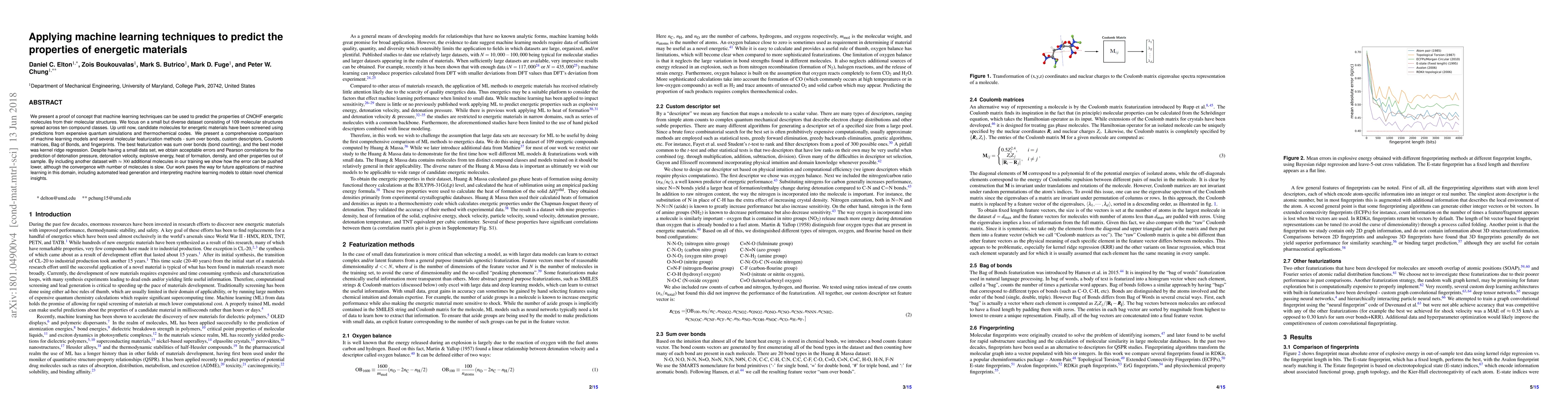 We present a proof of concept that machine learning techniques can be used to predict the properties of CNOHF energetic molecules from their molecular structures. We focus on a small but diverse dataset consisting of 109 molecular structures spread across ten compound classes. Up until now, candidate molecules for energetic materials have been screened using predictions from expensive quantum simulations and thermochemical codes. We present a comprehensive comparison of machine learning models and several molecular featurization methods - sum over bonds, custom descriptors, Coulomb matrices, bag of bonds, and fingerprints. The best featurization was sum over bonds (bond counting), and the best model was kernel ridge regression. Despite having a small data set, we obtain acceptable errors and Pearson correlations for the prediction of detonation pressure, detonation velocity, explosive energy, heat of formation, density, and other properties out of sample. By including another dataset with 309 additional molecules in our training we show how the error can be pushed lower, although the convergence with number of molecules is slow. Our work paves the way for future applications of machine learning in this domain, including automated lead generation and interpreting machine learning models to obtain novel chemical insights.