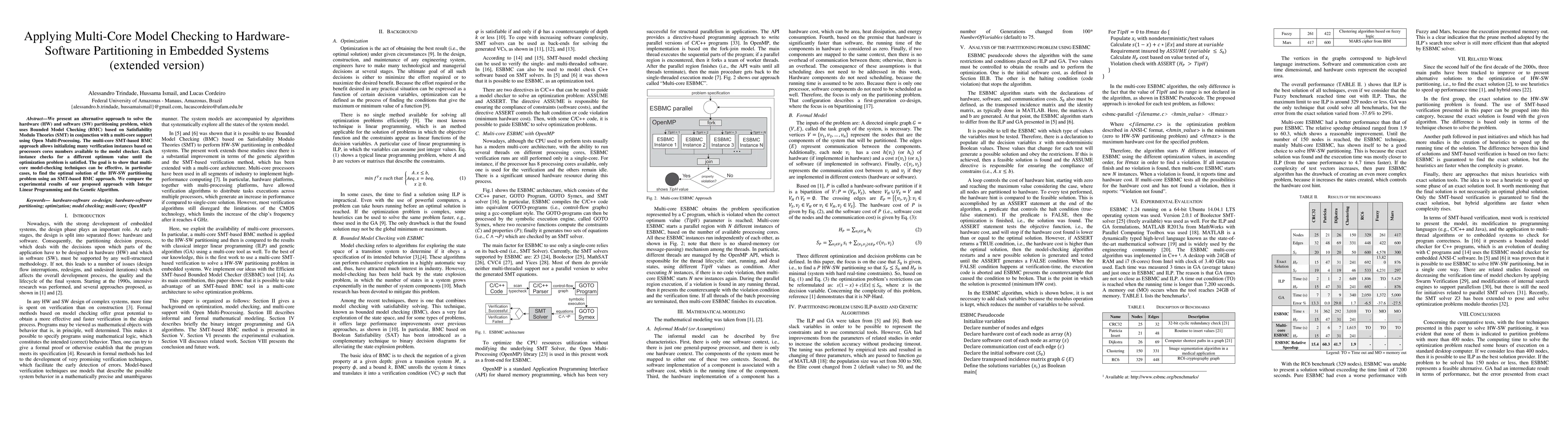 This paper proposes a multi-core SMT-based Bounded Model Checking approach to solve the hardware-software partitioning problem in embedded systems. The method leverages Open Multi-Processing to optimize solutions across multiple cores, demonstrating its effectiveness through comparisons with Integer Linear Programming and Genetic Algorithms.