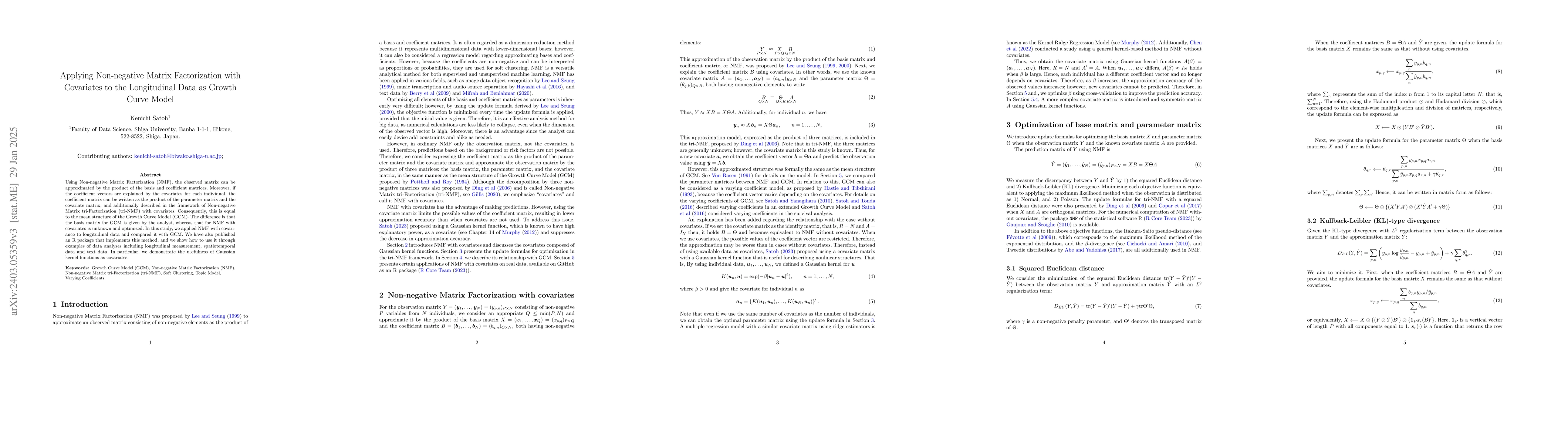 This paper proposes a method combining Non-negative Matrix Factorization (NMF) with covariates for analyzing longitudinal data, contrasting it with the traditional Growth Curve Model (GCM). An R package implementing this tri-NMF method is also introduced, showcasing its application through examples.