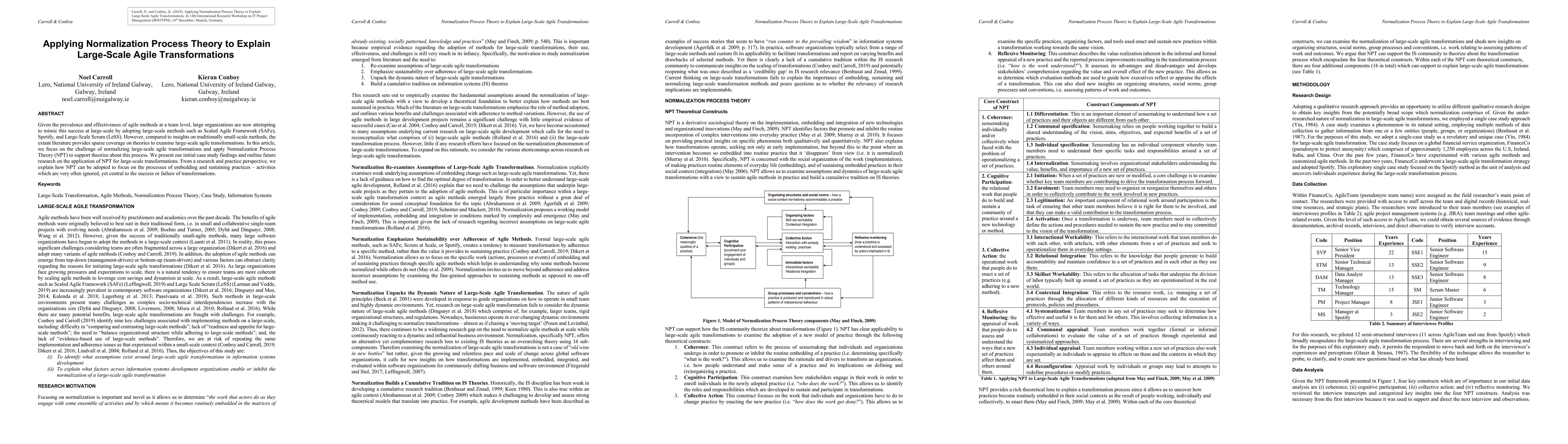 This paper applies Normalization Process Theory (NPT) to explore the challenges of embedding and sustaining large-scale agile transformations, such as SAFe, Spotify, and LeSS. It highlights the importance of focusing on the processes and activities that often determine the success or failure of these transformations.